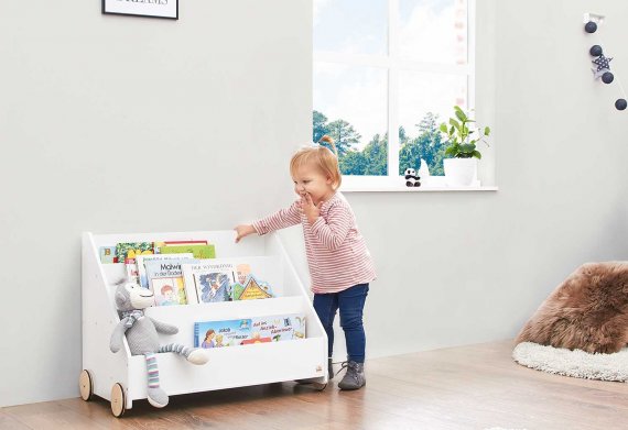 En bogreol i børnehøjde er ideel. Den hygger og giver barnet lyst til at læse eller kigge billeder i bøger. Kan blive en fin intro. til bøger og læsning. Bogreolen er flytbar og hjulene er gummibelagte, så de ikke ridser gulvet ved flytning. Reolen har et hemmeligt rum på bagsiden!