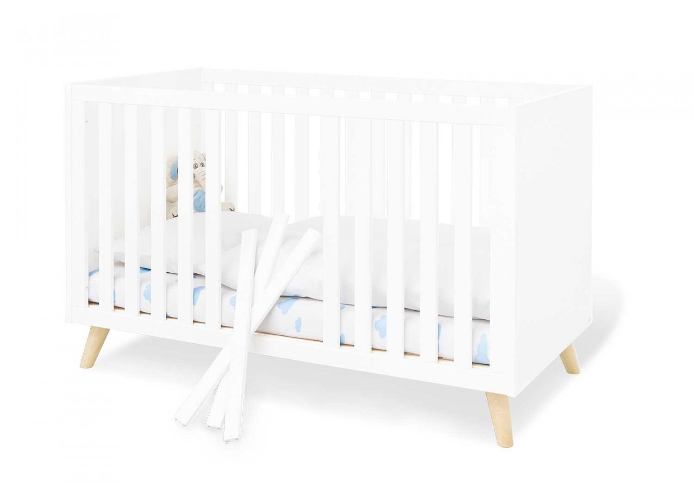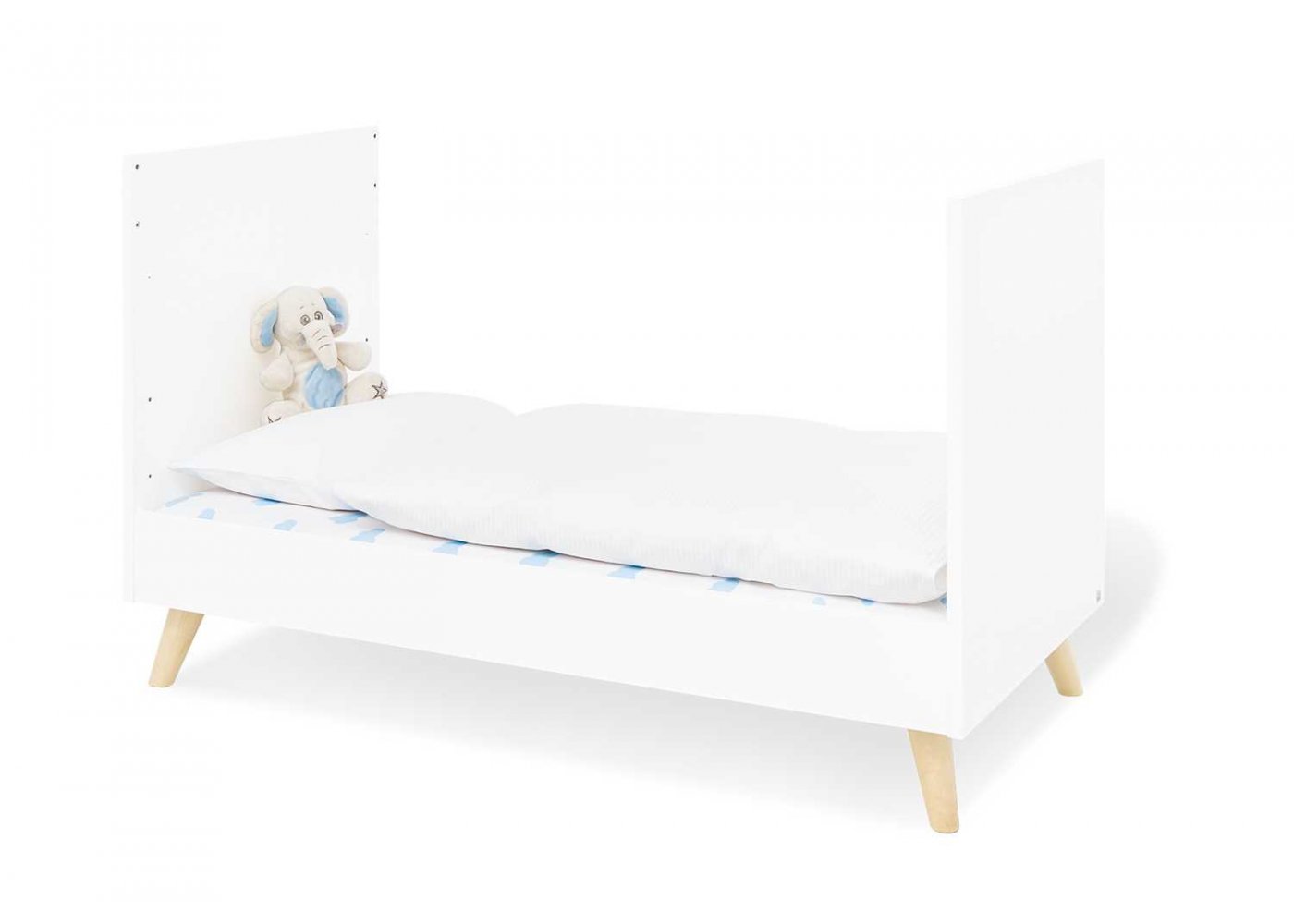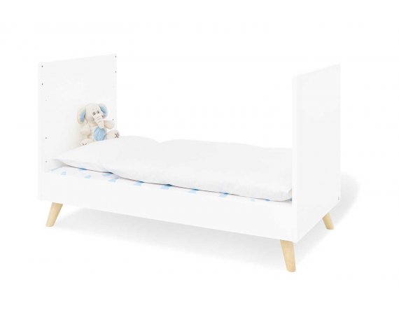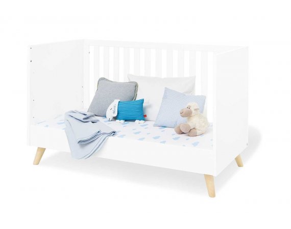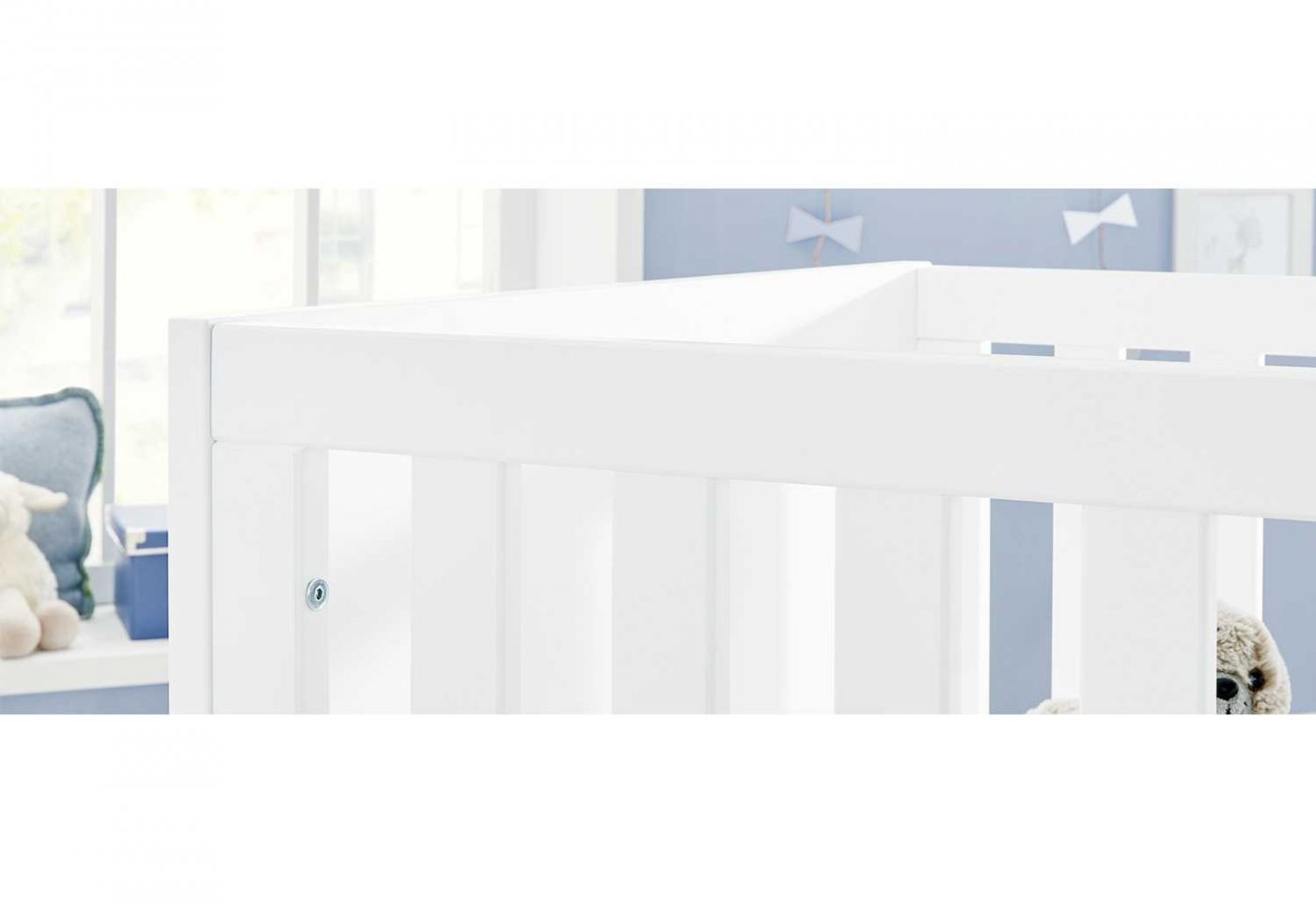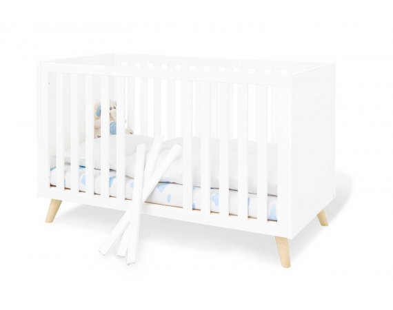 Lamelbunden er massiv og kan indstilles i 3 højder. Sengens sider er forstærkede, så den er meget robust og stabil. Når dit barn bliver større, kan tremmesiderne tages af, de medfølgende to sidepaneler monteres, og du har en fin juniorseng.