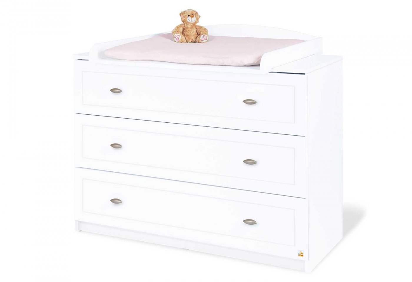 Puslekommoden har 3 skuffer, hvor af den ene er opdelt i to rum.