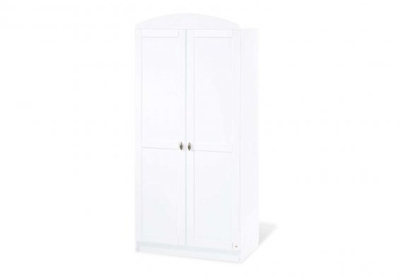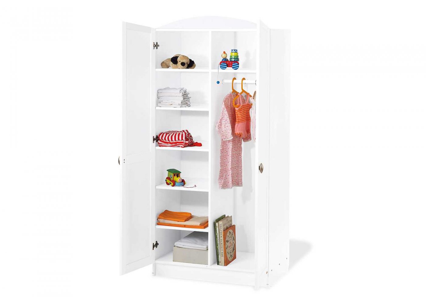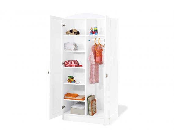 Garderobeskabet er opdelt i to sektioner og har flytbare hylder og klædestang.