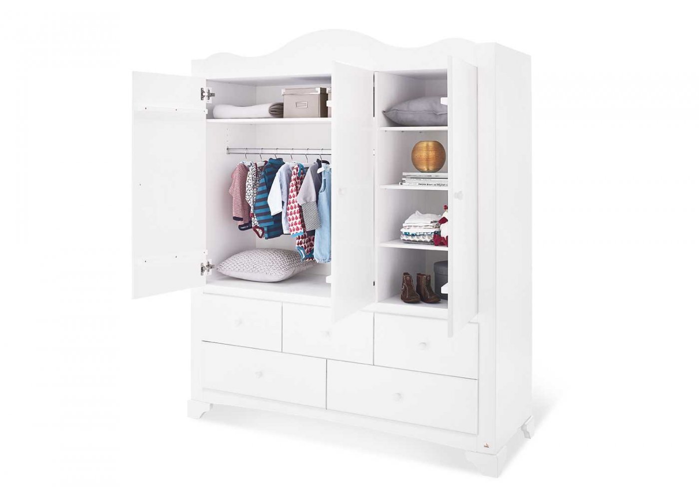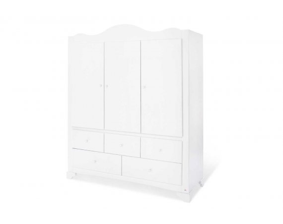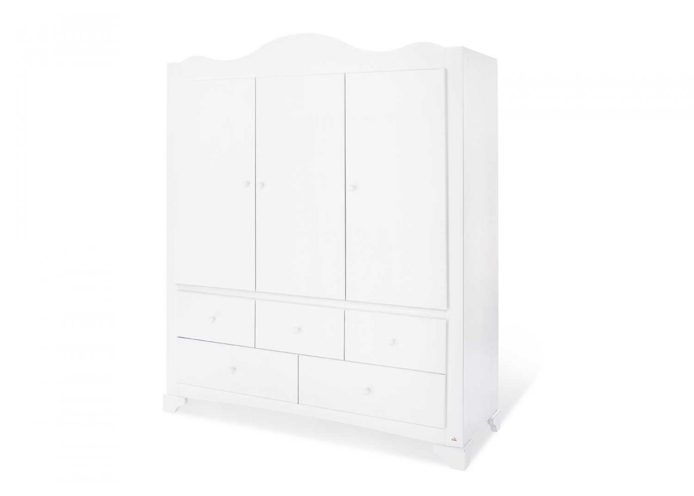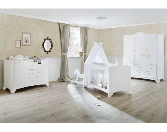 Børnemøbelsæt Pino i massiv træ. Sættet består af en kombiseng, et stort klædeskab med 3-døre og en ekstra bred puslekommode.