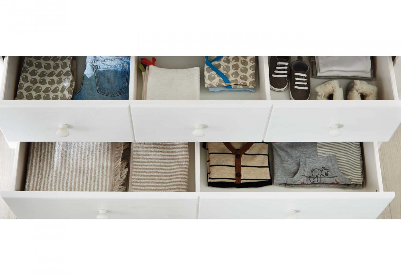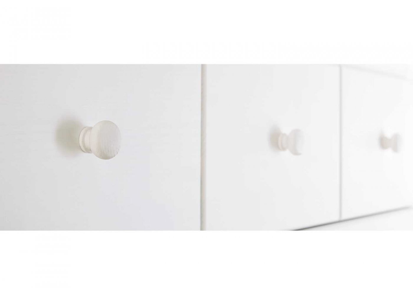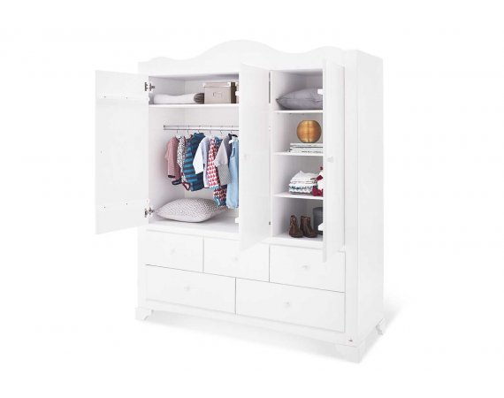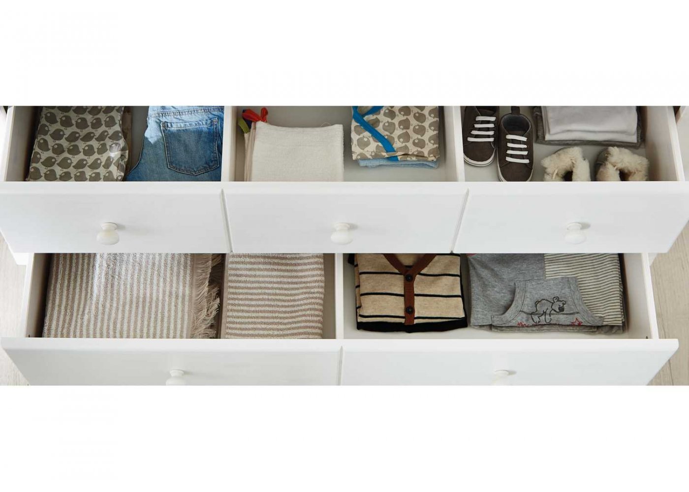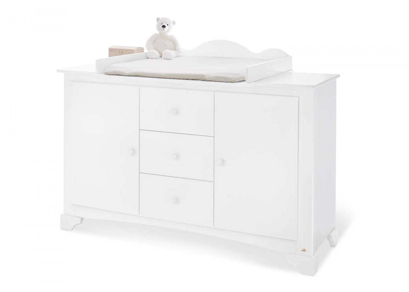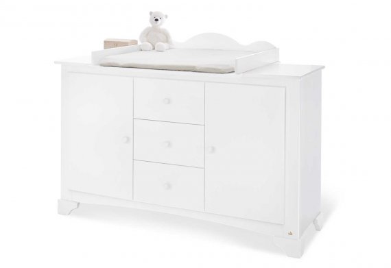 Om den ekstra brede puslekommode: Puslekommoden har to skabe og tre skuffer i midten. Kommoden leveres med to justerbare hylder og en bøjlestang. Pusledelen er smart, idet den kan monteres både til venstre, højre og midt for. Når der ikke længere er brug for pusleplads til dit barn, kan pusledelen fjernes, og du har en fin kommode til brug i hele hjemmet.
