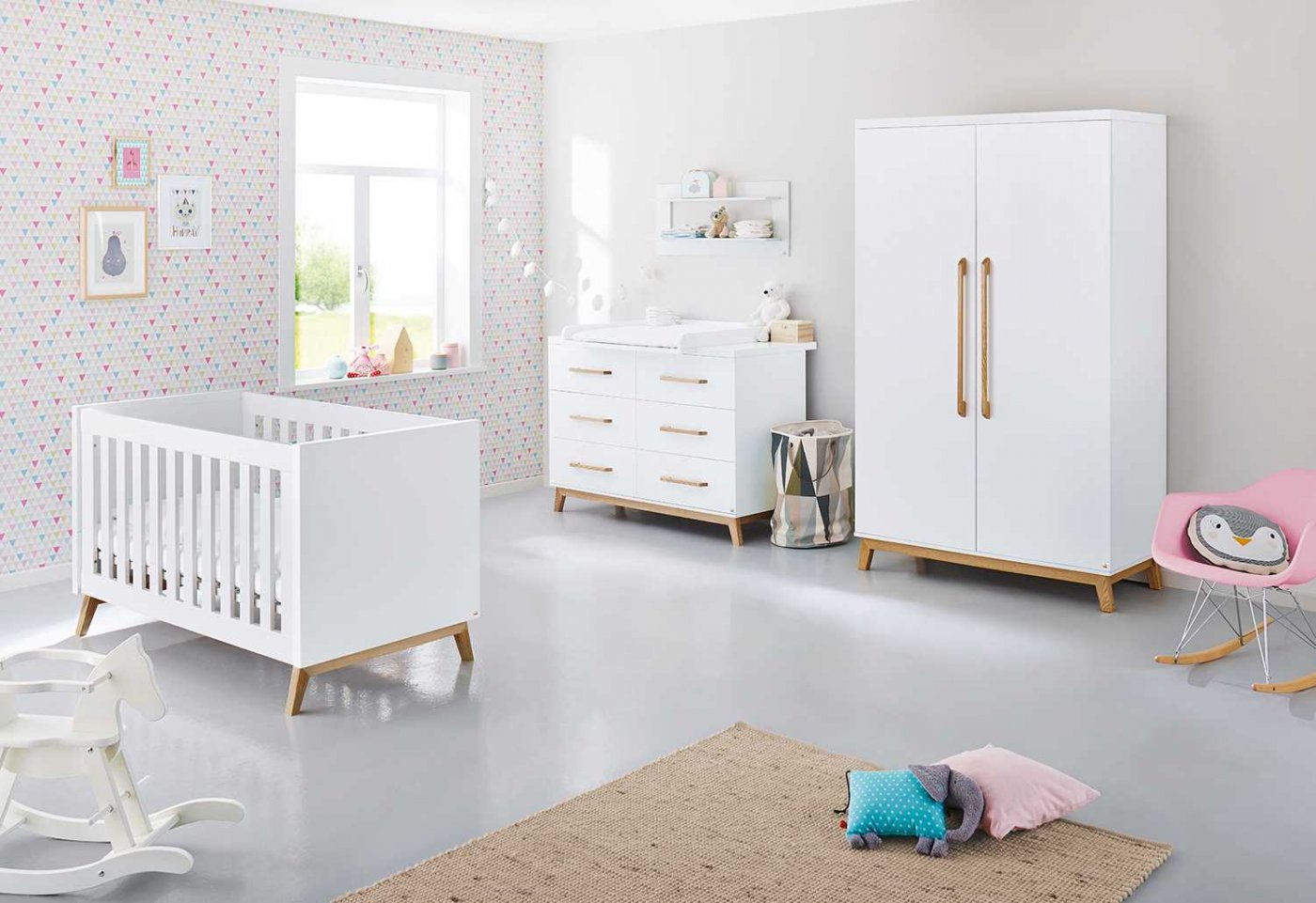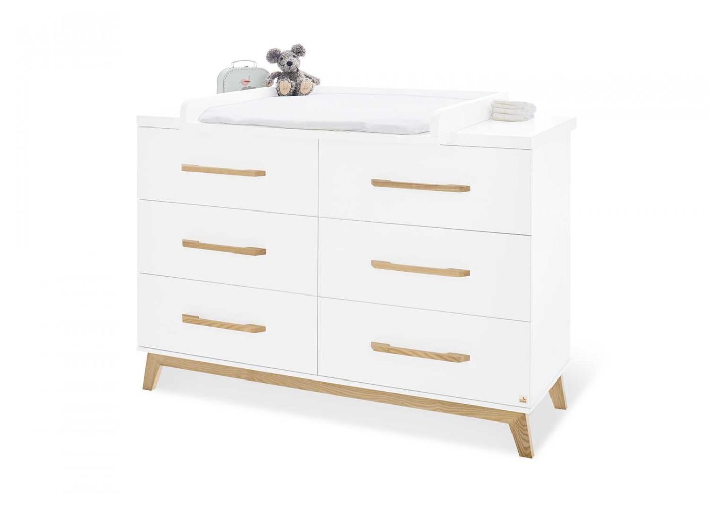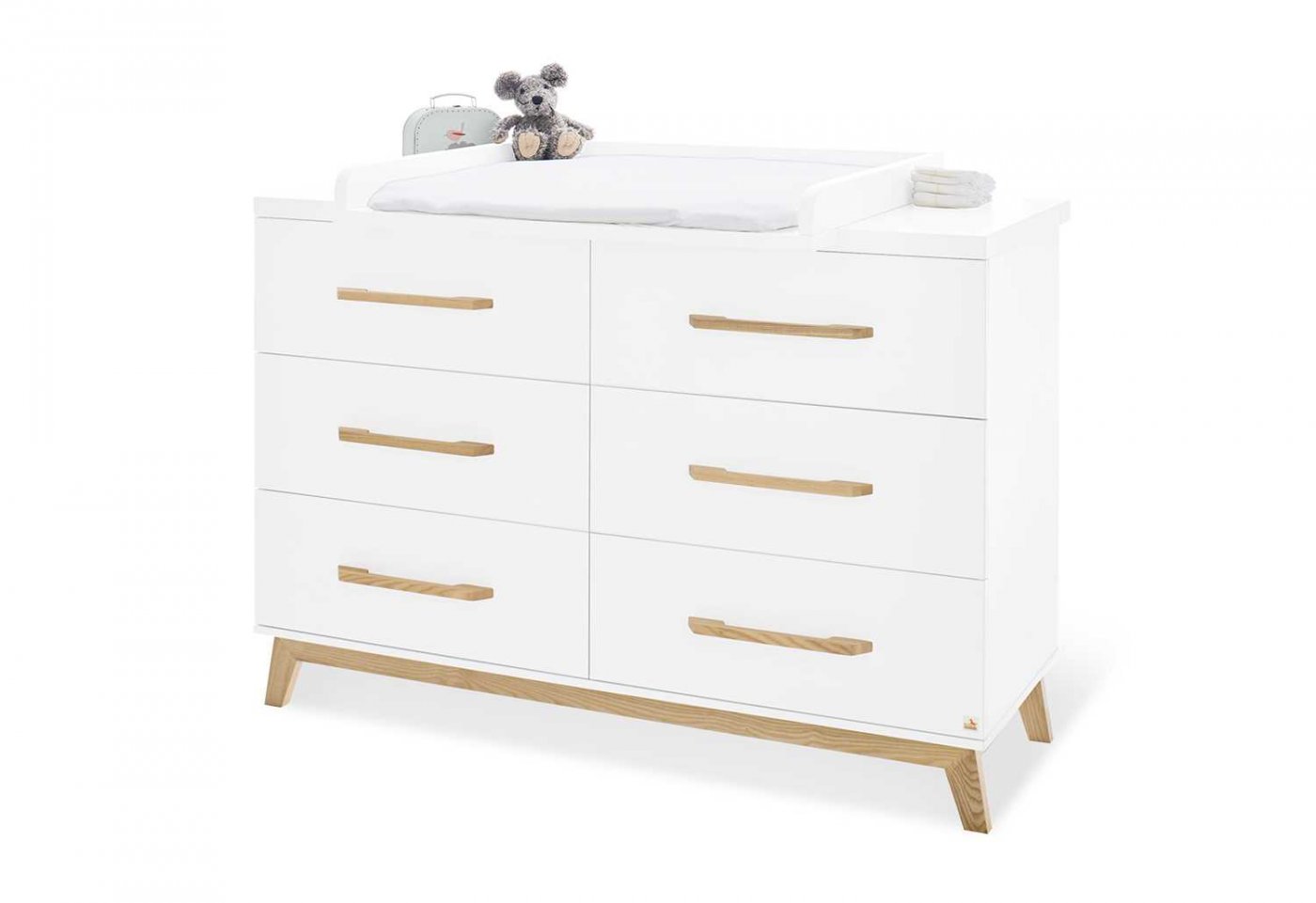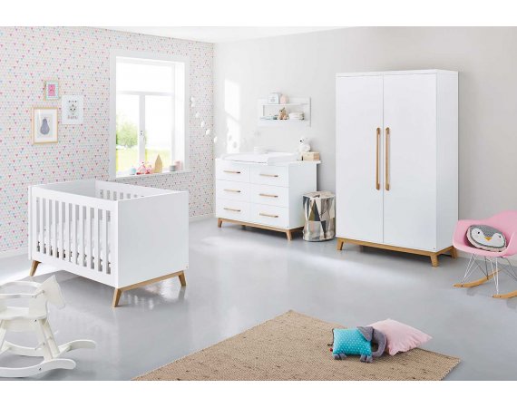 En ekstra bred puslekommode, en kombiseng og et to dørs klædeskab.