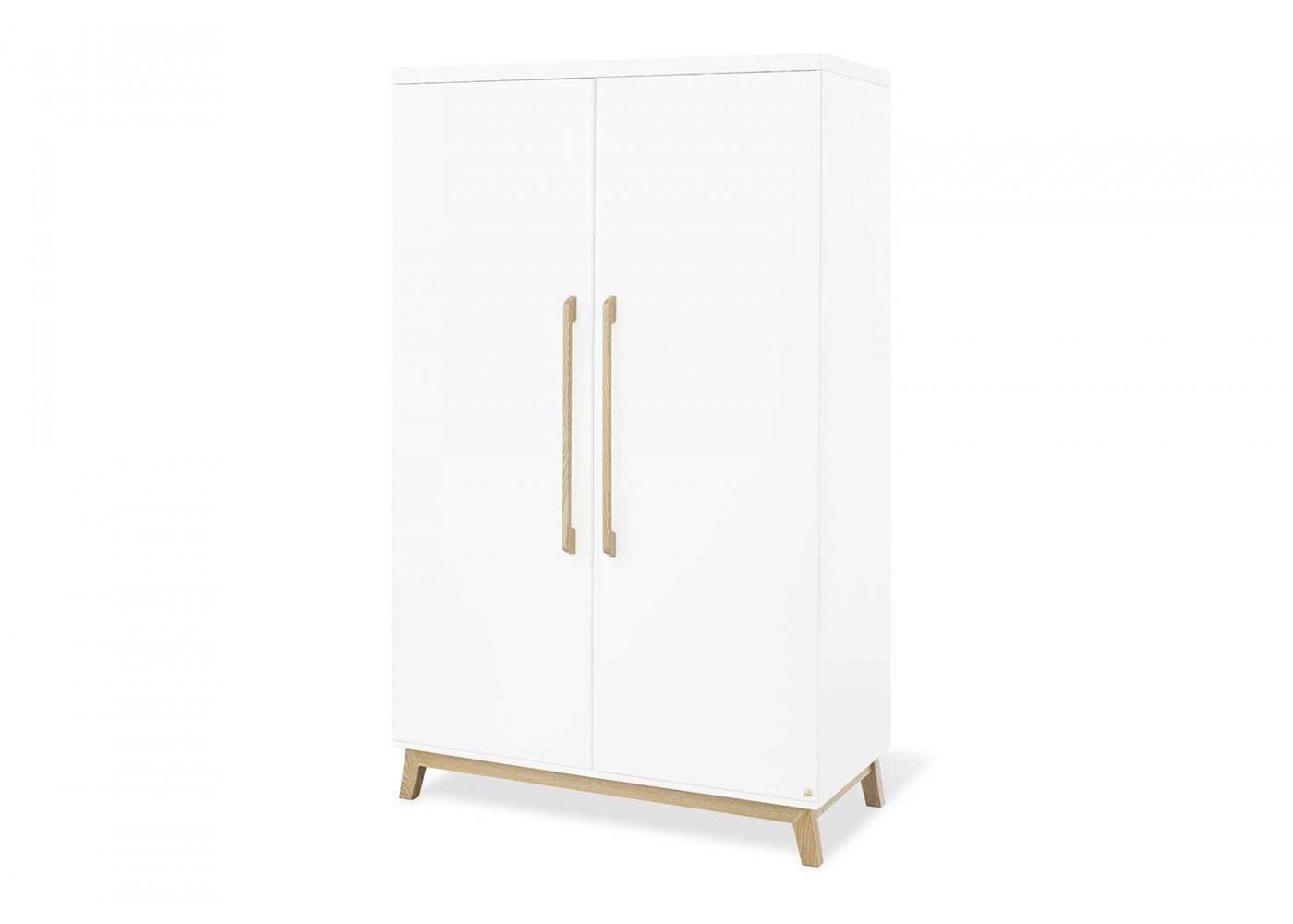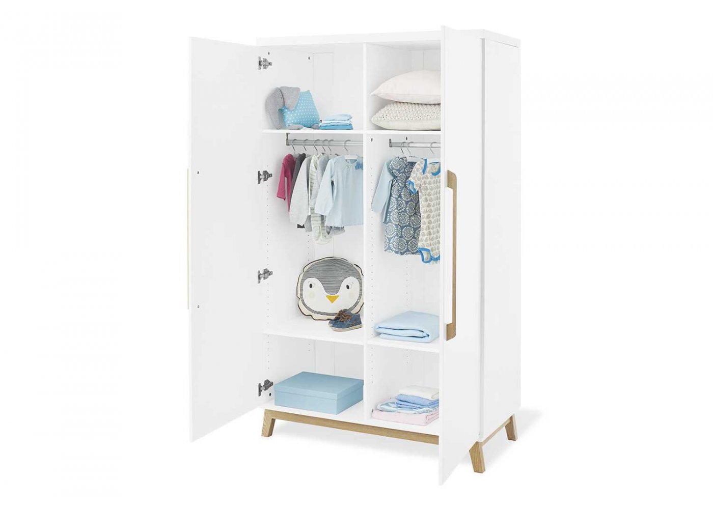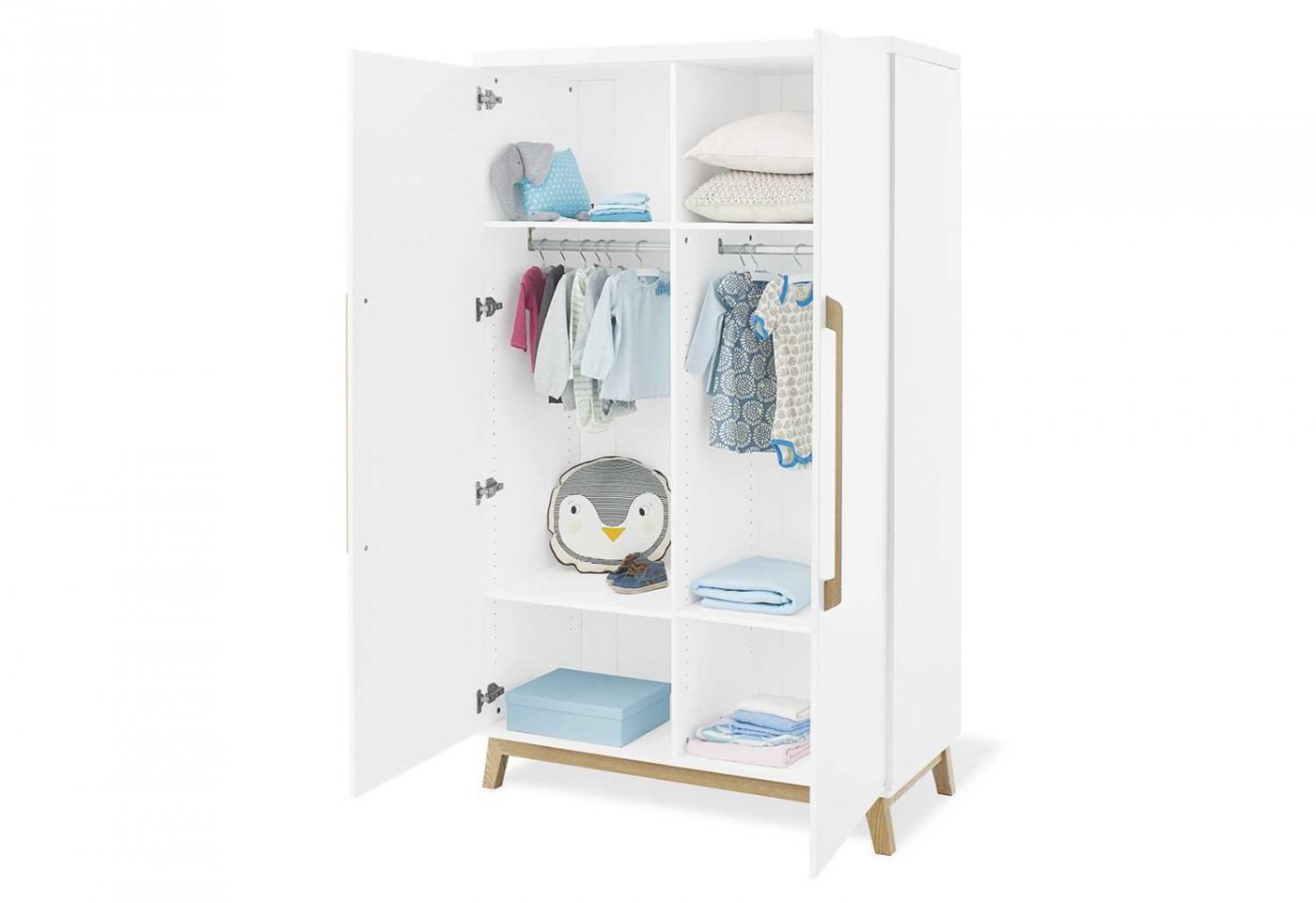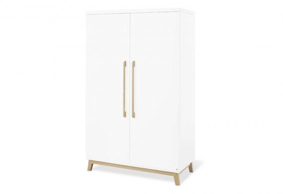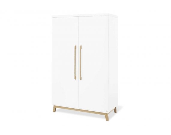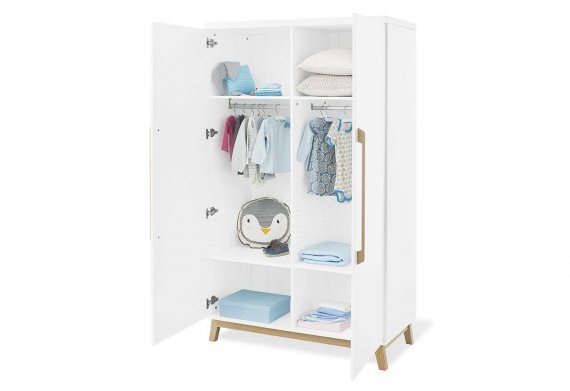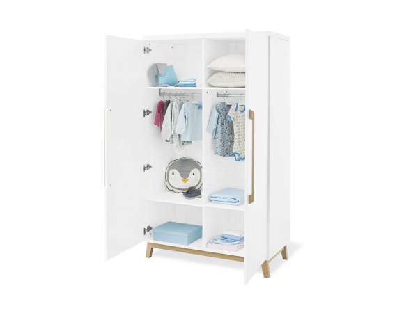 Garderobeskabet Riva har to døre og er opdelt i to. Der medfølger fire flytbare hylder til skabet og to bøjlestænger. Hvis du har brug for flere hylder, er det muligt at tilkøbe dem.