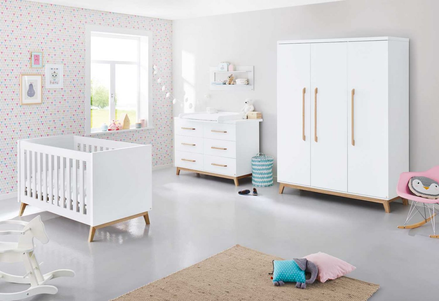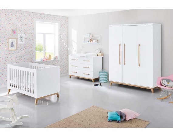 En ekstra bred puslekommode, en kombiseng og et tre dørs klædeskab.