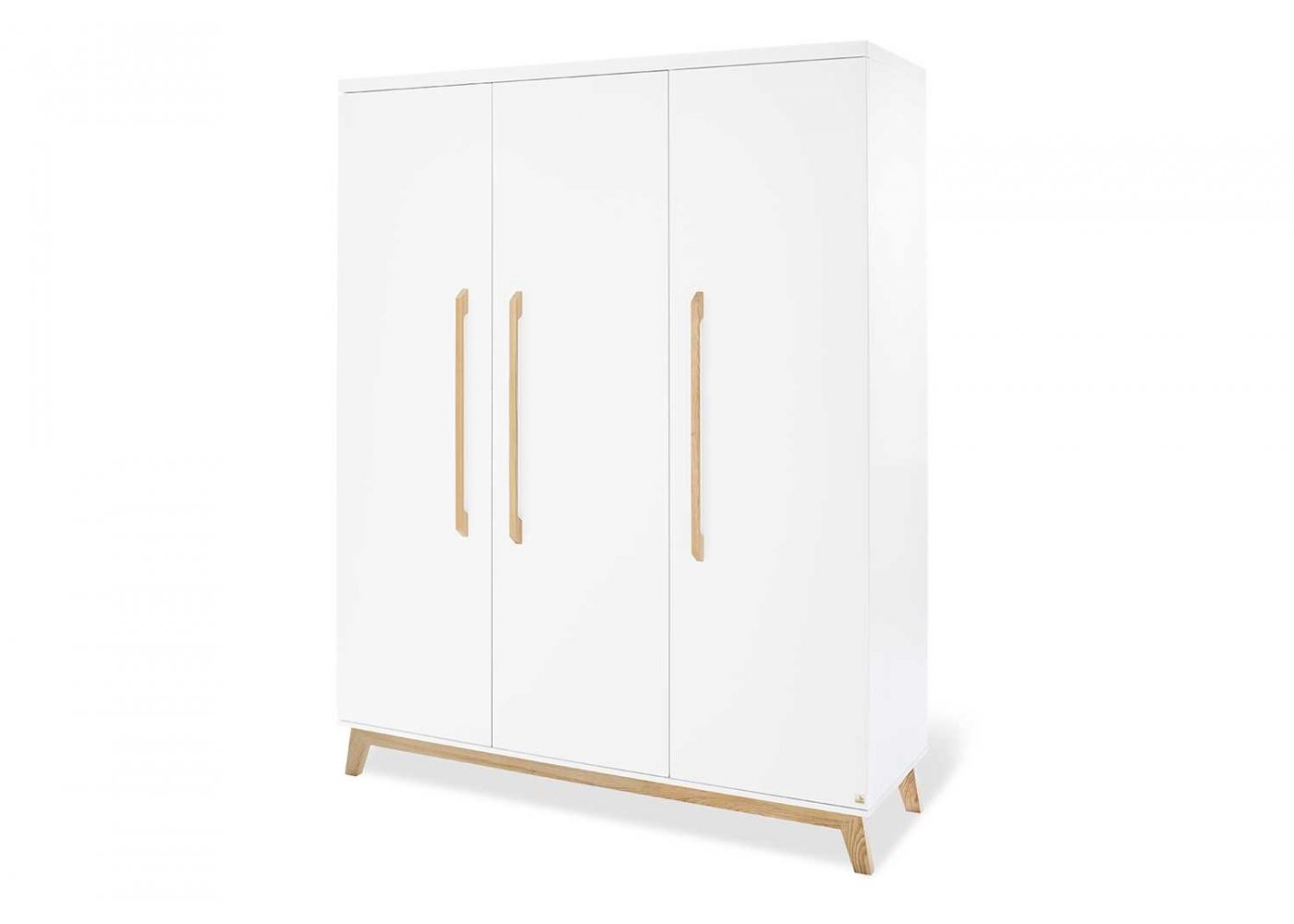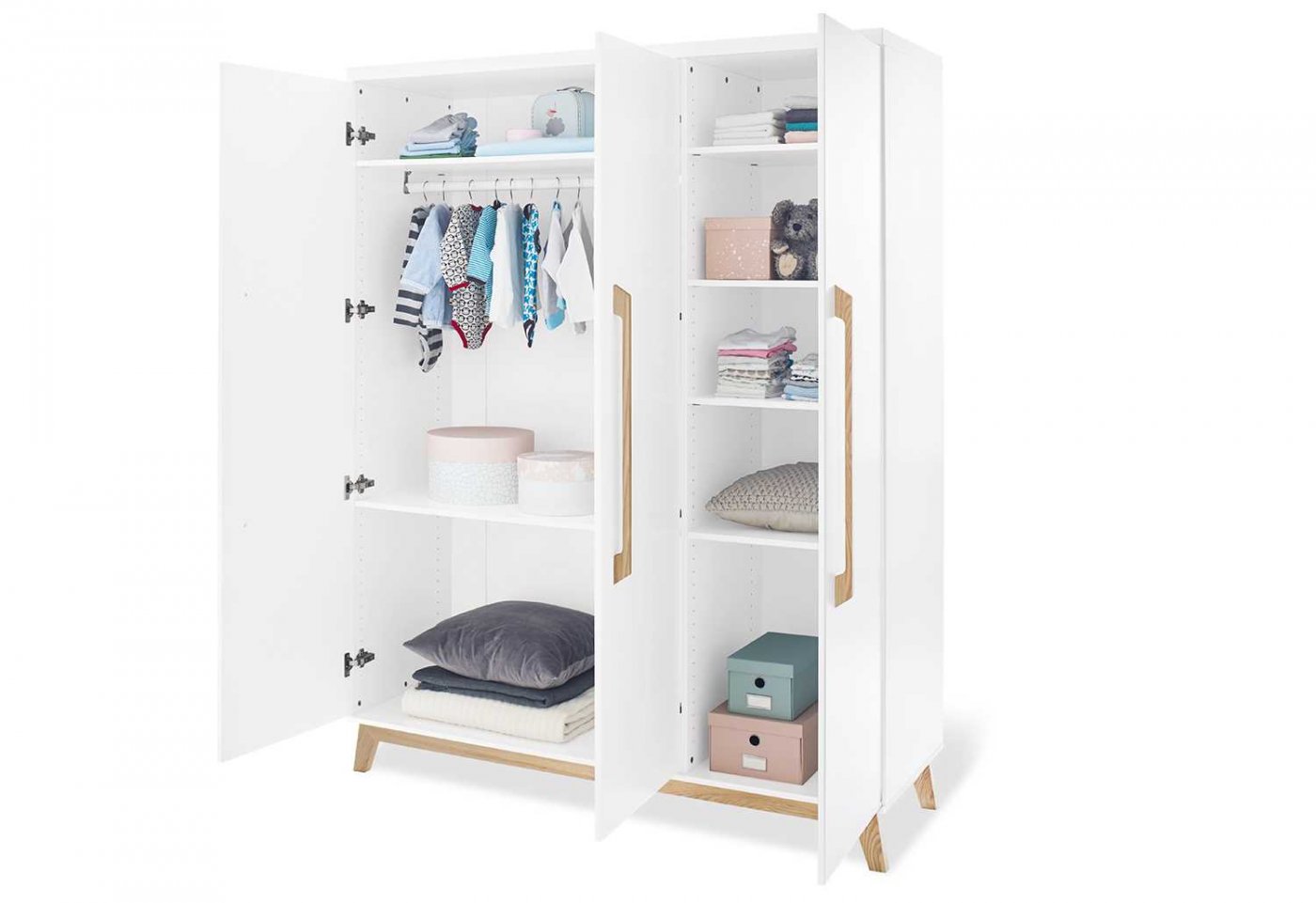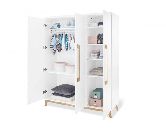 Garderobeskabet Riva har tre døre og er opdelt i to. Der medfølger seks flytbare hylder til skabet og en bøjlestang. Hvis du har brug for flere hylder, er det muligt at tilkøbe dem.