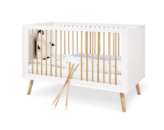 Pinolino kombi sengen har flotte, slanke, runde tremmer. Lamelbunden er massiv og sengens sider forstærkede, så den er meget robust og stabil.