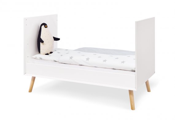 Når dit barn bliver større, kan tremmesiderne tages af, de medfølgende to sidepaneler monteres, og du har en fin juniorseng.