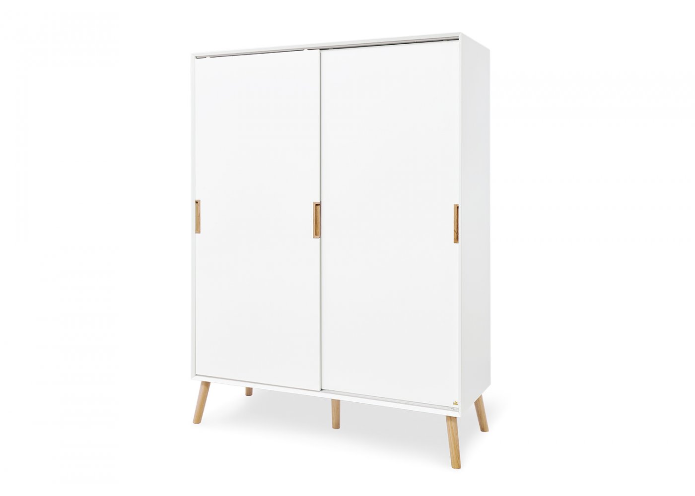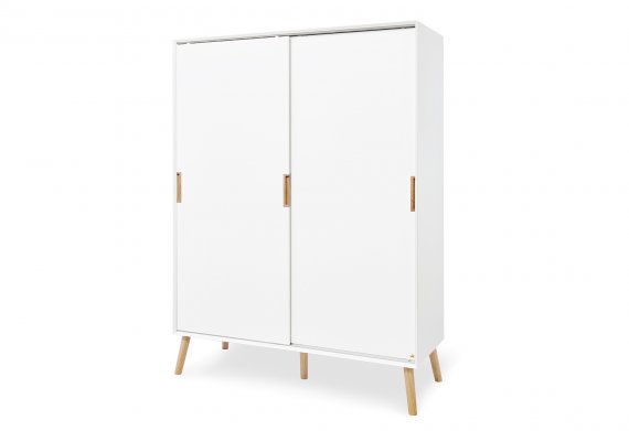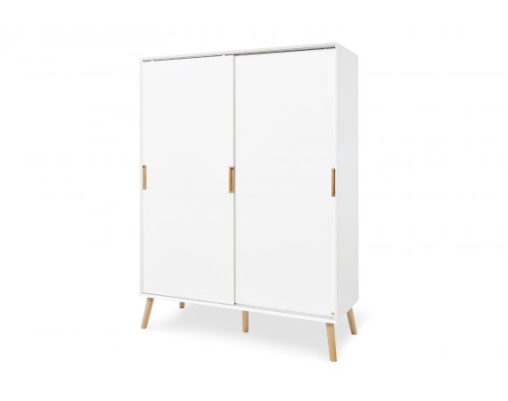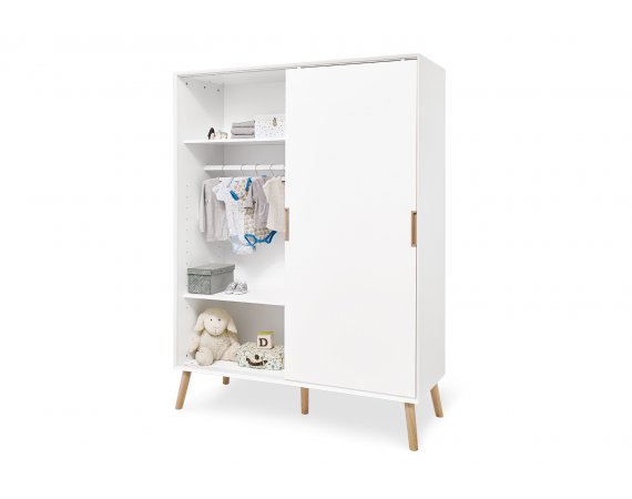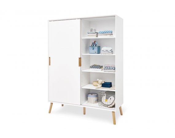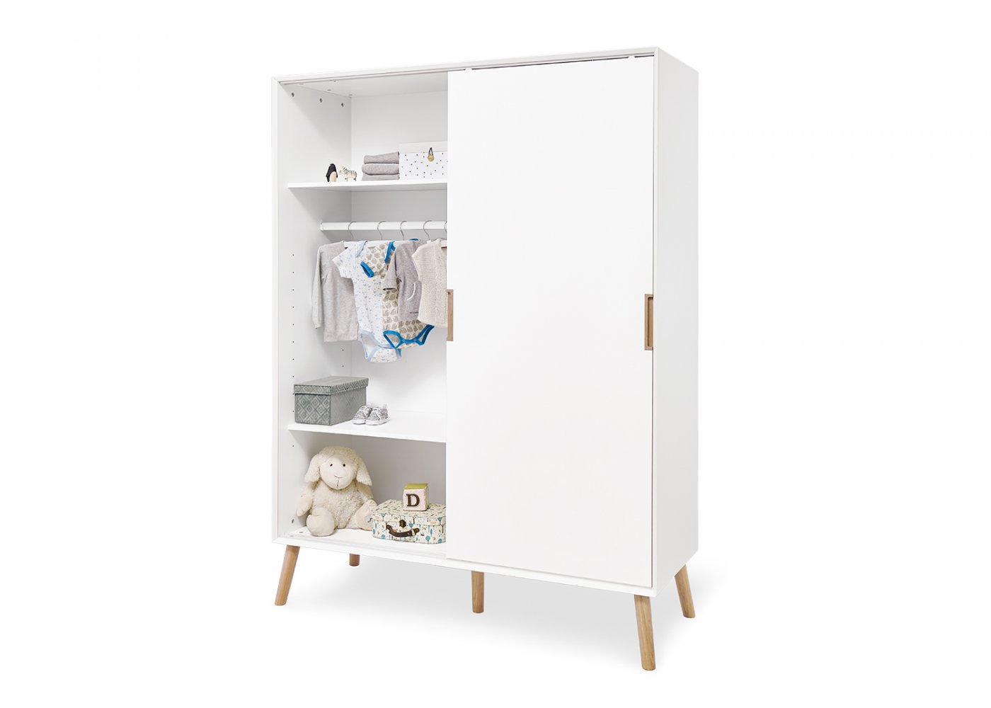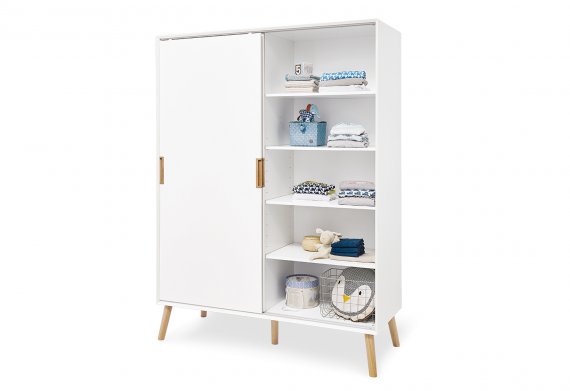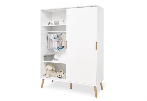 Skabet er praktisk og smart indrettet med to skydedøre, 6 flytbare hylder og en bøjlestang.