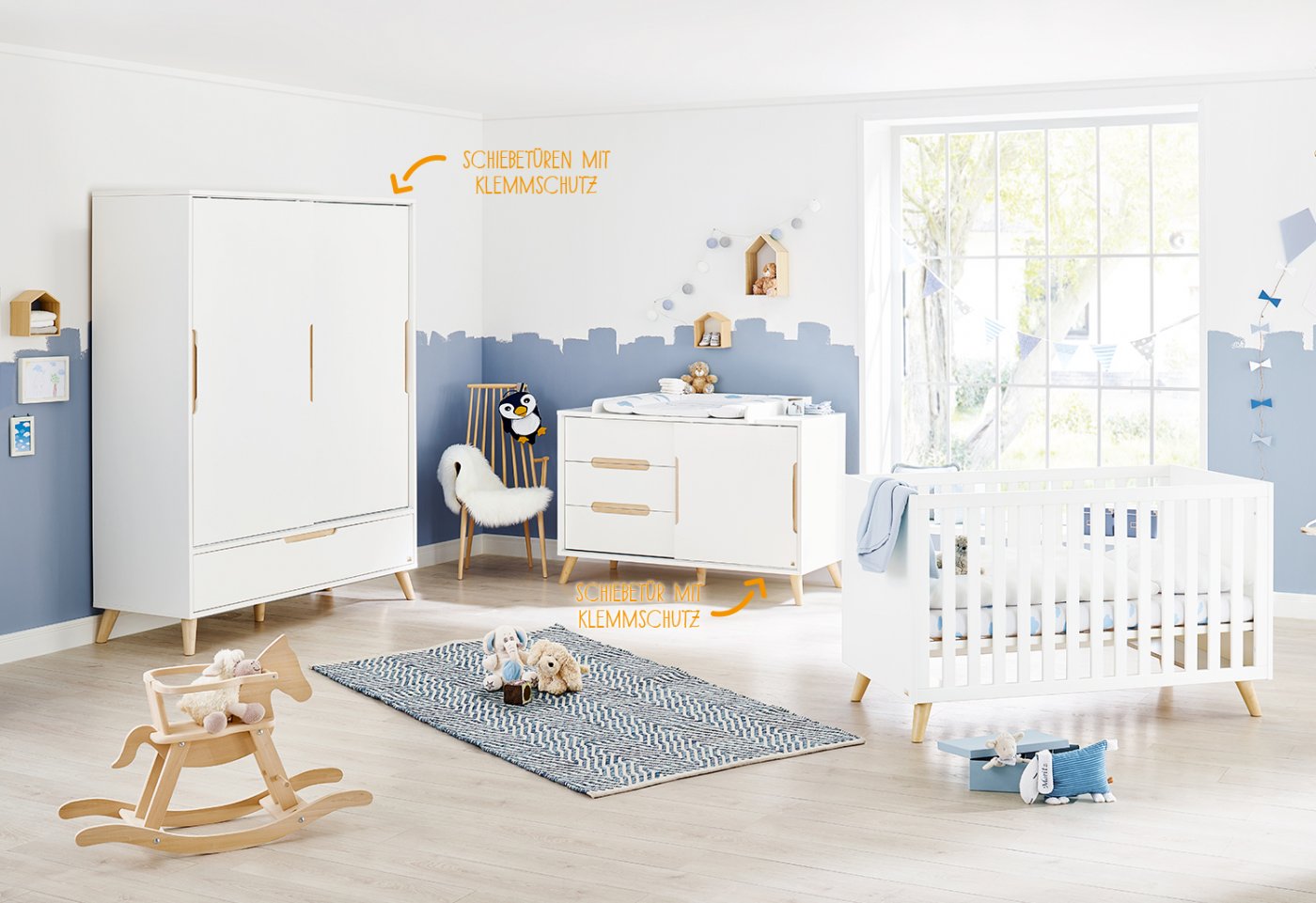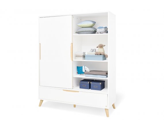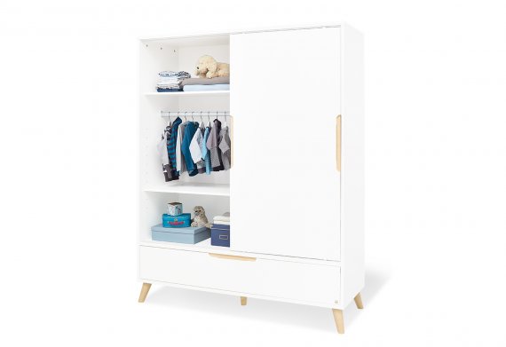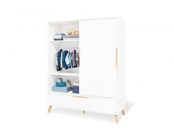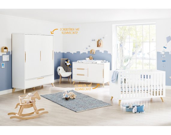 Move møbelsæt fra Pinolino består af et stort klædeskab, en ekstra bred puslekommode og en flot kombiseng