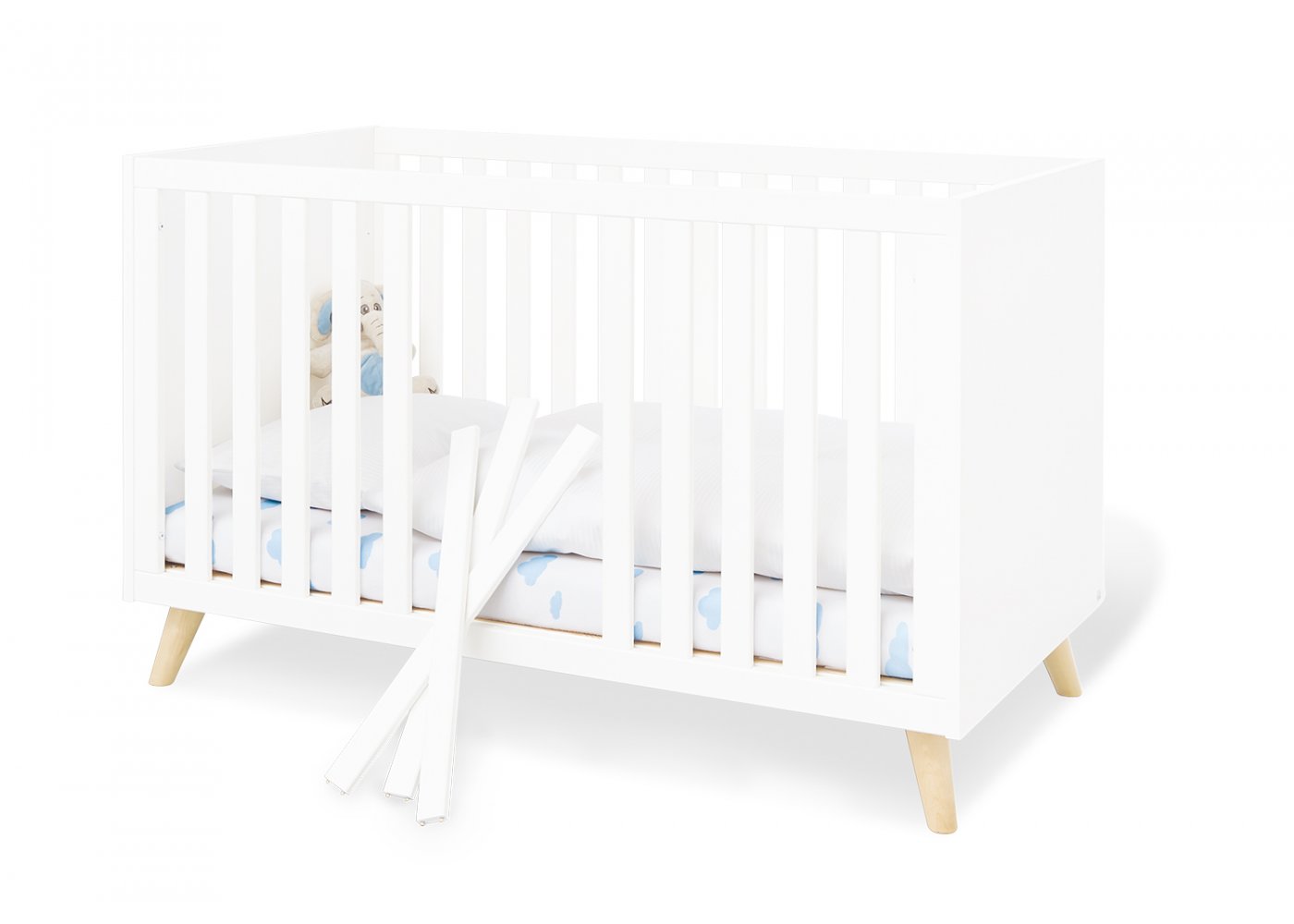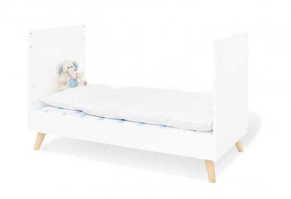 Lamelbunden er massiv og kan indstilles i 3 højder. Sengens sider er forstærkede, så den er meget robust og stabil. Når dit barn bliver større, kan tremmesiderne tages af, de medfølgende to sidepaneler monteres, og du har en fin juniorseng.