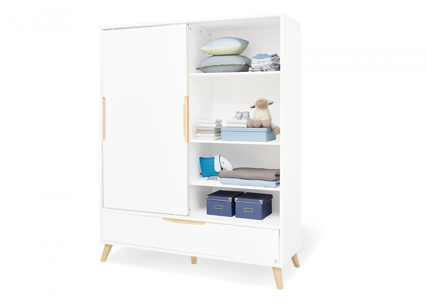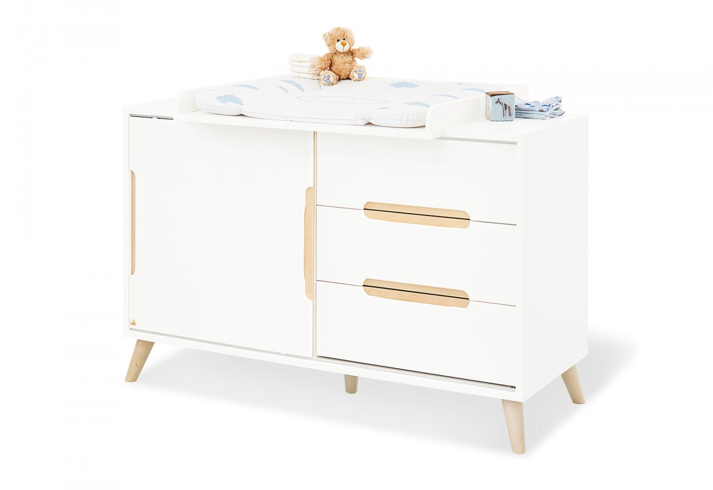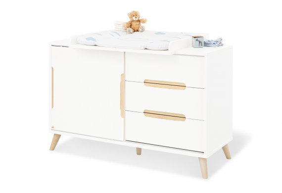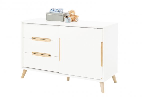 Puslekommoden har tre store skuffer i den ene side, en skydedør med en hylde i den anden side og forsænkede greb i massiv ahorn. Hylder og skydedør kan placeres efter eget ønske.