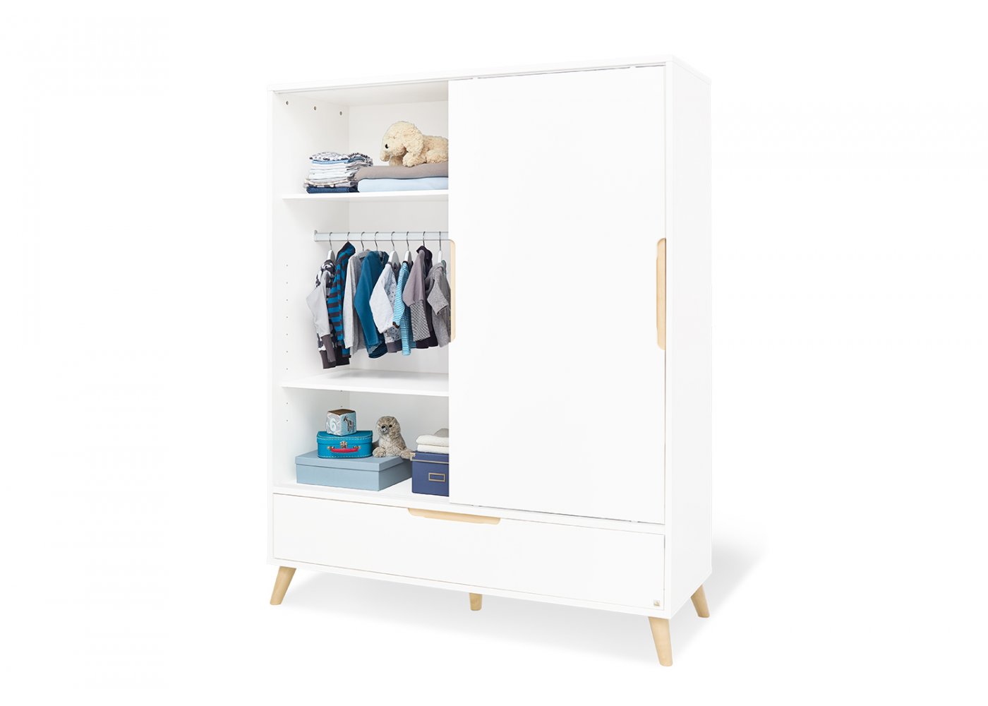 Skabet er opdelt i to sider. I den ende sider er tre hylder og i den anden side to hylder samt en bøjlestang. Skabet har en stor to-opdelt skuffe nederst.