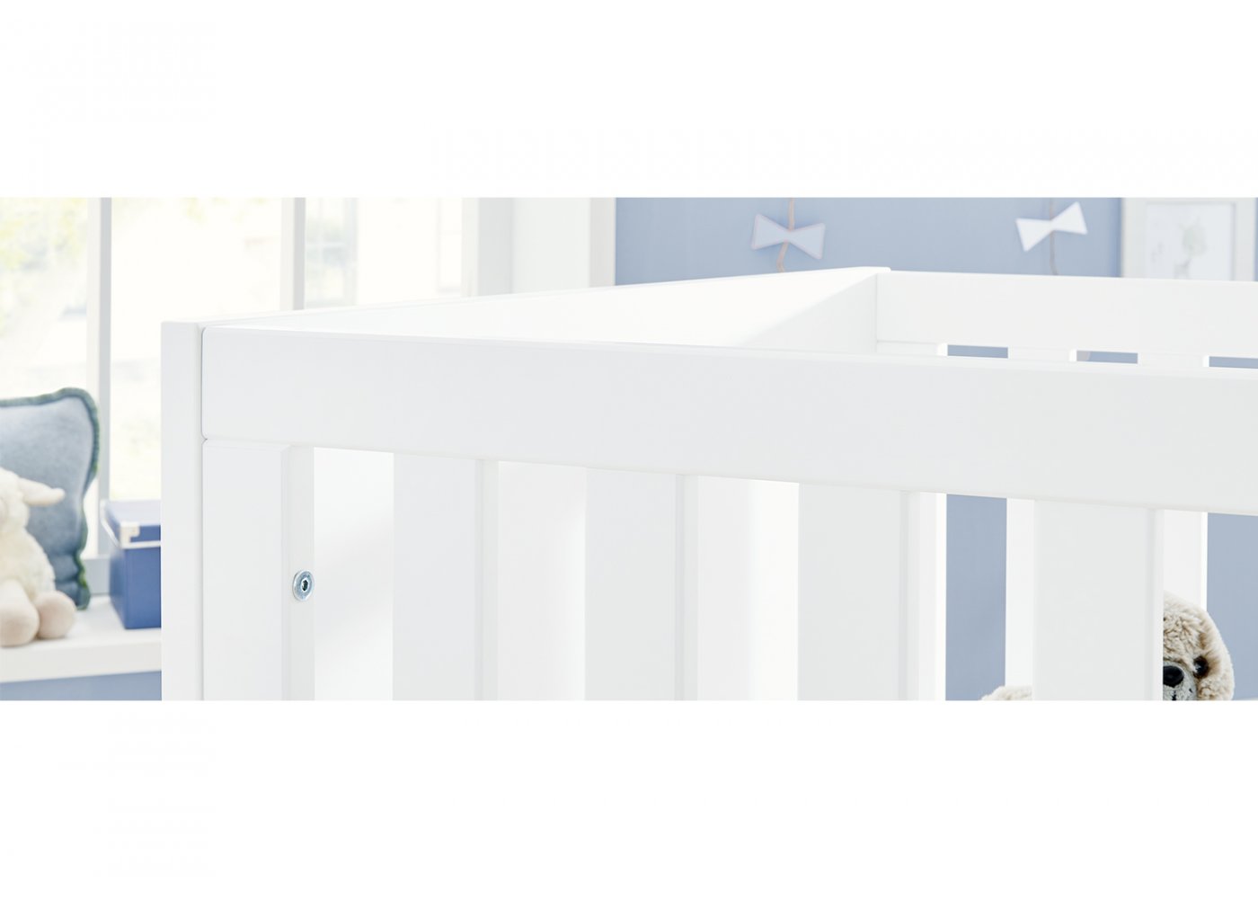 Børnesengen Moves liggemål er større end en almindelig babyseng og kan derfor vokse med dit barn. Sengen har brede flade tremmer.