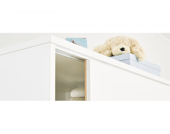 Børneværelses serien Move er en smuk møbelserie i skandinavisk design, hvor naturligt ahorn træ indgår. Møbelserien fremstår med en kombination af hvidt og rå træ, der giver et flot, unikt og moderne udseende. Skuffer og skabe har Self-Soft-Close, Soft-Close og safe slide.
