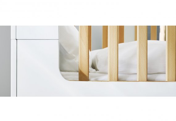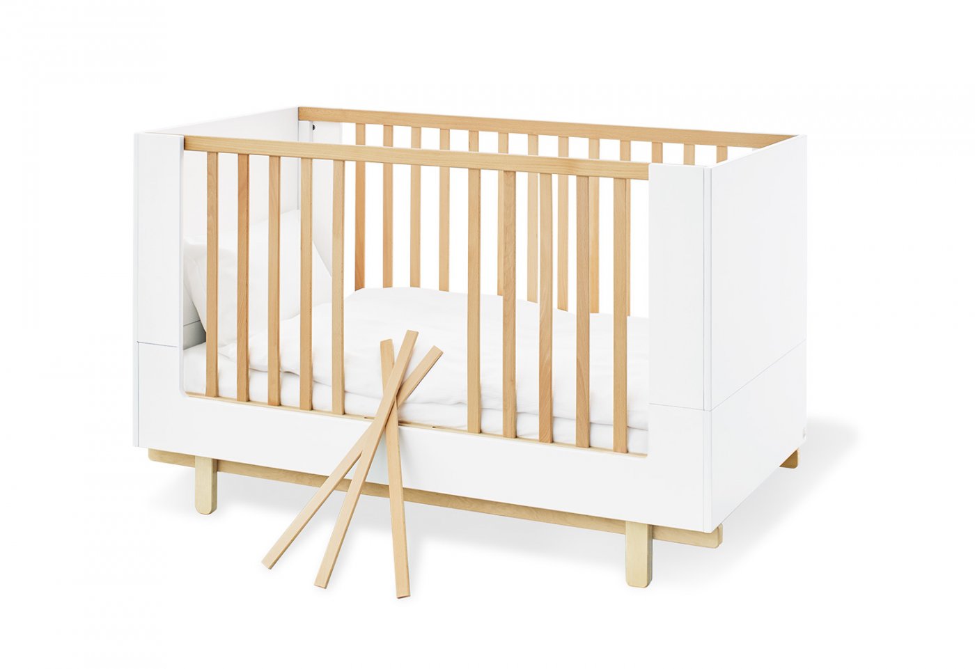 Når dit barn bliver større, kan tremmesiderne tages af, de medfølgende to sidepaneler monteres, og du har en fin juniorseng.