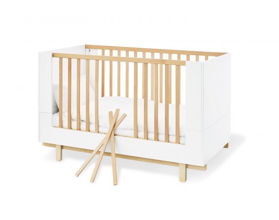 Pinolino kombi sengen har flade smalle tremmer. Lamelbunden er massiv og sengens sider forstærkede, så den er meget robust og stabil.