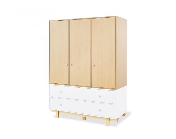 Et klædeskab er uundværligt og skal kunne indrettes individuelt, da behov er forskelligt. Skabet er praktisk og smart indrettet med tre døre og to store skuffer nederst. Hver skuffe er opdelt i to sektioner. Der medfølger desuden syv flytbare hylder og en bøjlestang. Hvis det ønskes, kan der tilkøbes ekstra hylder til skabet