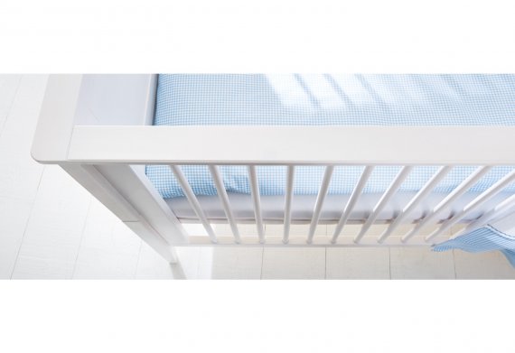 Børnesengens lamelbund er massiv og sengens sider forstærkede, så den er meget robust og stabil.
