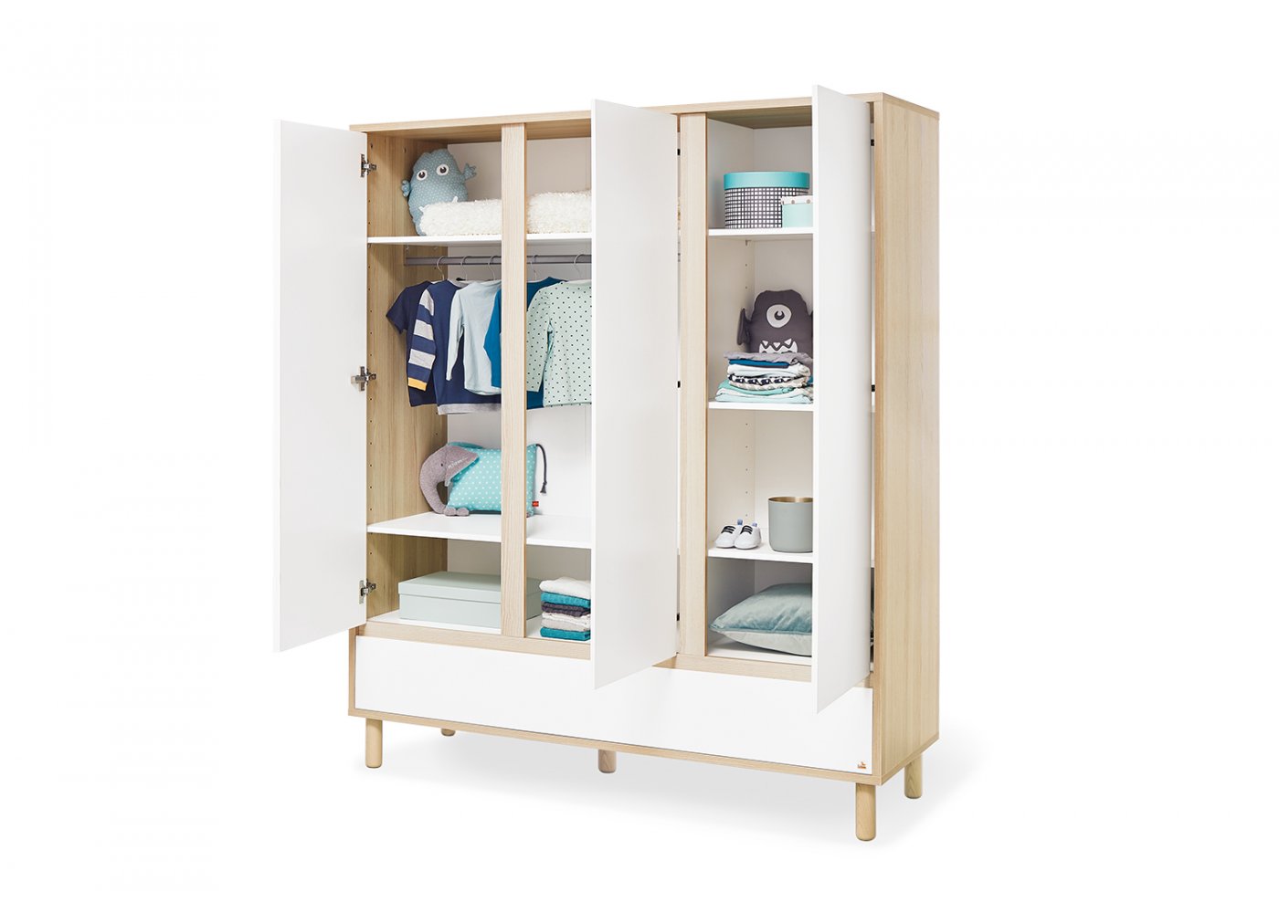 Et klædeskab er uundværligt og skal kunne indrettes individuelt, da behov er forskelligt. Skabet er praktisk og smart indrettet med tre døre og en skuffe nederst. Der medfølger desuden fem flytbare hylder og en bøjlestang. Hvis det ønskes, kan der tilkøbes ekstra hylder til skabet