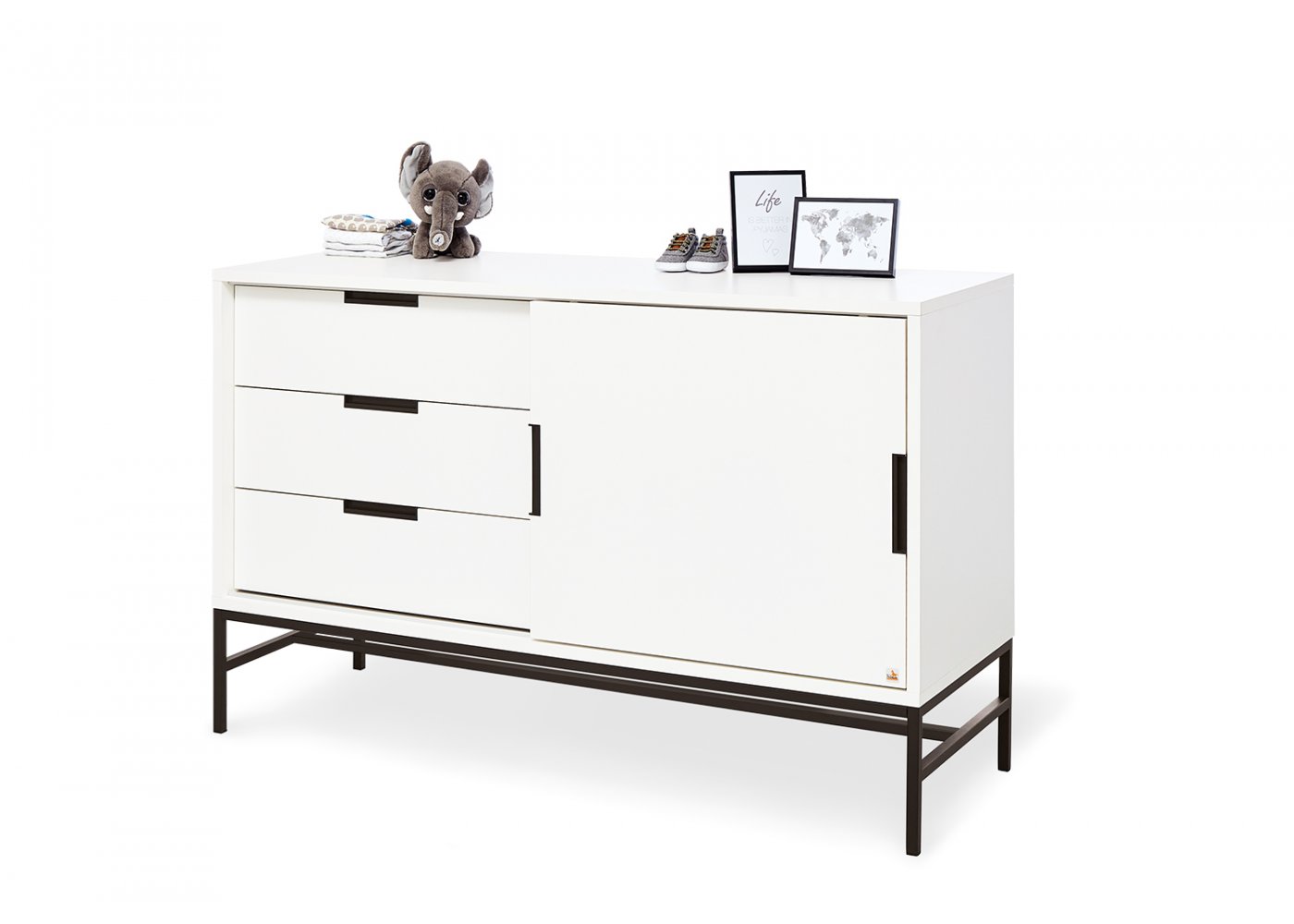 Kommoden har tre store skuffer i den ene side og en skydedør i den anden med en hylde. Skuffer og skydedør kan placeres efter individuel ønske.