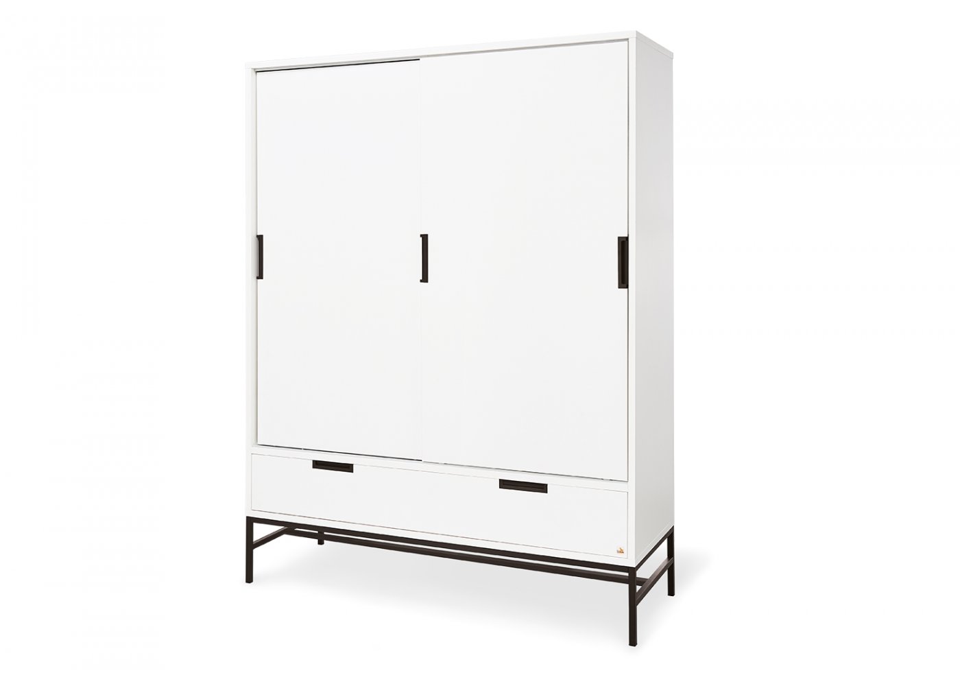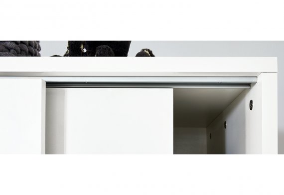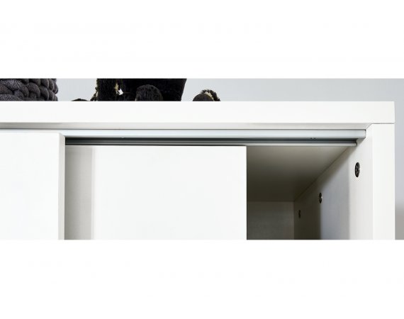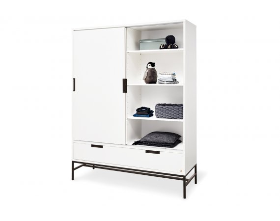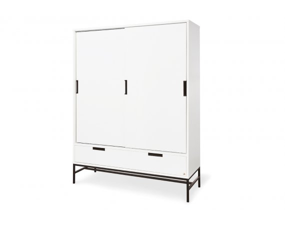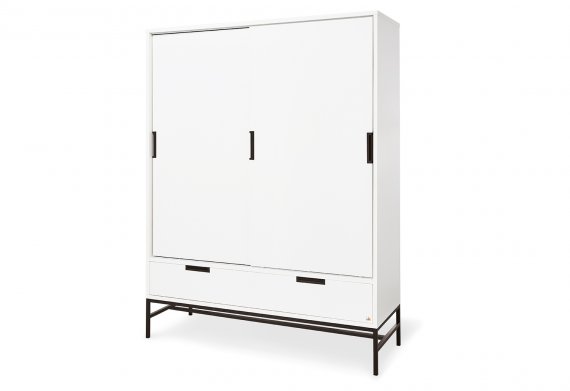 Skabet er praktisk og smart indrettet med to skydedøre og en opdelt skuffe nederst.