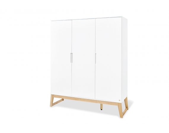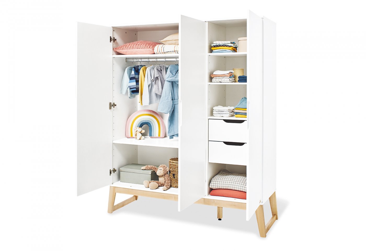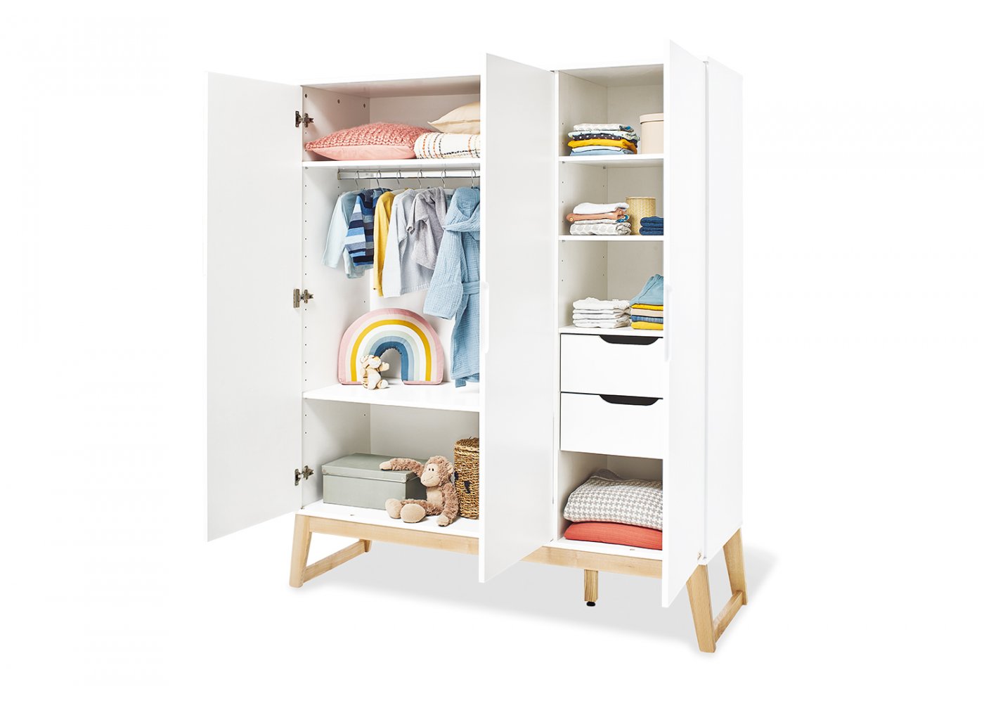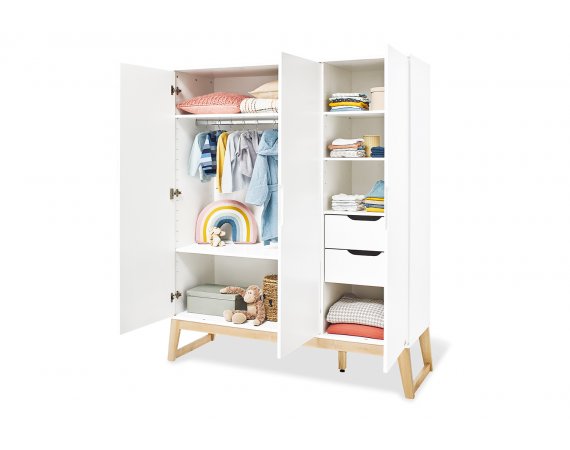 Garderobeskabet har tre døre, og er opdelt i to sektioner. Der er to indbyggede skuffer og der medfølger fem flytbare hylder til skabet og en bøjlestang. Hvis du har brug for flere hylder, er det muligt at tilkøbe dem.