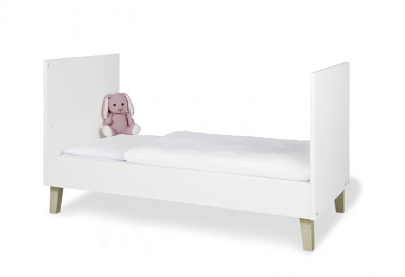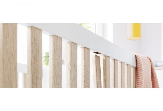 Når dit barn bliver større, kan tremmesiderne tages af, de medfølgende to sider til sengen monteres, og du har en fin juniorseng.