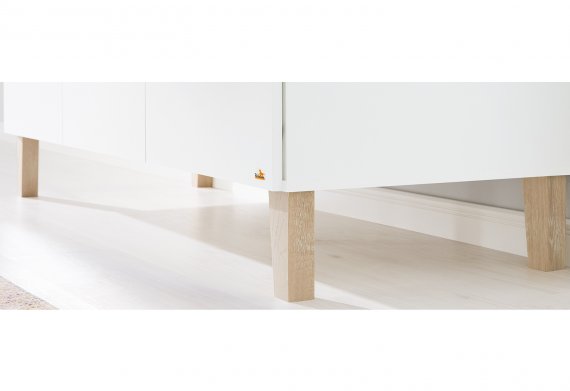 Lumi fra Pinolino er et skønt børnemøbelsæt, hvor din egen fantasi og kreativitet kan være med til at skabe et særligt og egen design på børneværelset. Møblerne er moderne og samtidig diskrete med en blanding af hvide fronter og ege-decor. De smukke skråtstillede egetræsben i retro stil, egetræs greb og flade tremmer på sengen er unikke og giver til sammen et moderne look, et gedigent og flot udseende. Sokler og greb til serien er i massivt egetræ. Møblernes skuffer og skabe har self-soft-close og soft close.