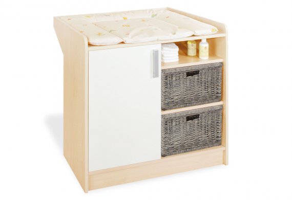 Puslekommoden består af et skab med hylde, og tre åbne hylder til opbevaring af tøj, bleer og vådservietter. Suppler eventuelt puslebordet med flotte pileflet kurve og skab dit helt eget look. Se Pinolinos flotte udvalg.