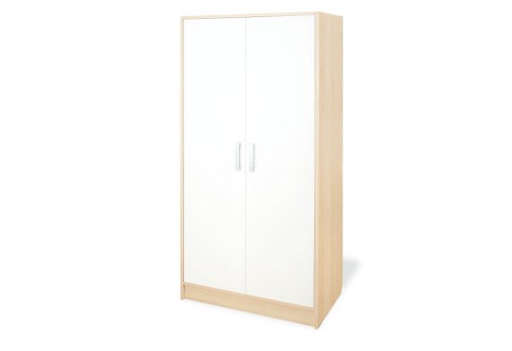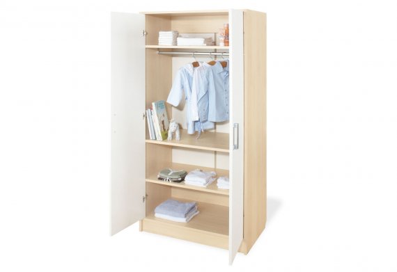 Skabet har to låger, men er ikke opdelt i to, når det åbnes. Klædeskabet har en bøjlestang, der fylder hele skabets bredde, så der er plads til rigtig meget tøj på bøjlestangen. Er desuden udstyret med tre brede flytbare hylder.