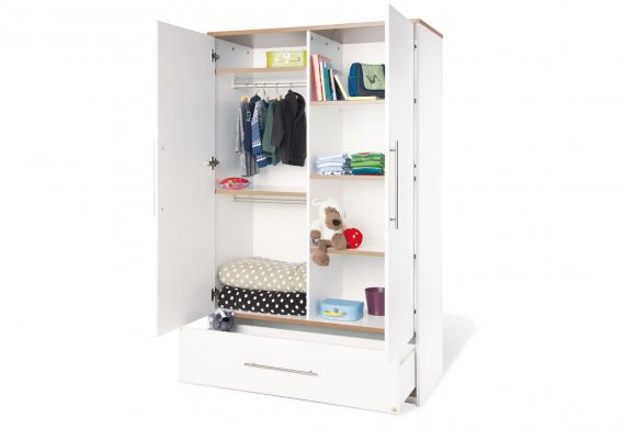 Skabet er praktisk indrettet med to døre og en stor skuffe nederst. Der medfølger desuden 5 flytbare hylder og 2 bøjlestænger. TUULA klædeskabet har stilfulde smalle metal greb og skuffer og skabe har Self-Soft-Close. Et smukt, enkelt og stilfuldt klædeskab. Der kan tilkøbes ekstra hylder til skabet.