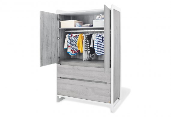 Garderobeskabet Curve er opdelt i to sektioner. Øverst et stort rum med hylde og bøjlestang. Nederst to store rummelige skuffer til både tøj eller legetøj. Hvis du har brug for ekstra hylder, er det muligt at tilkøbe dem. Curve skabet er grebsfri og skuffer og skabslåger har Self-Soft-Close.