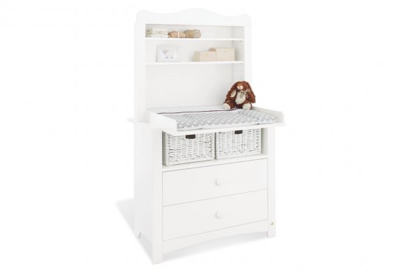 Kommoden har to store skuffer og en åben hylde, hvor du eventuelt kan vælge en flot håndlavet Pinolino kurv og pynte op med. Disse er tilkøb.