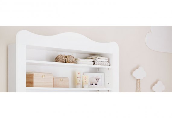 Reoloverdelen har to justerbare hylder med plads til pudder, creme og andet, der er rare at have lige ved hånden, når du pusler din baby. Den skaber hygge og passer til møbelserien Florentinas brede puslekommode.