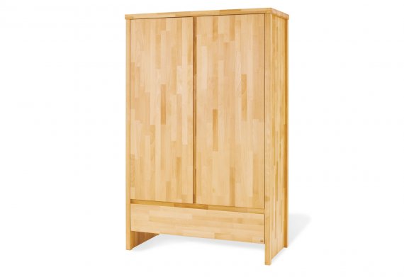 2-dörrars garderob: B 117 cm, D 55 cm, H 185 cm 2 dörrar, 1 låda Self-Soft-Close och Soft Close Inbyggda handtag 4 justerbara hyllor, 1 klädstång Massiv bok, oljebehandlad med möbelolja baserad på linolja. Klart synlig trästruktur