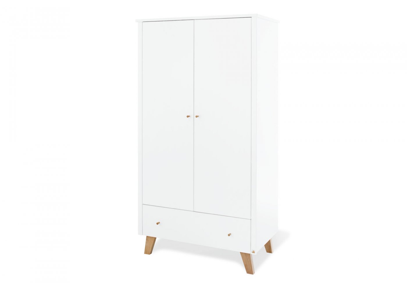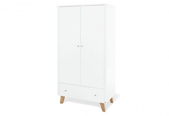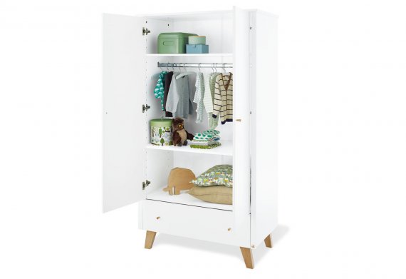 Garderobeskabet Pan har to døre, men er ikke opdelt. Skabet har nederst en stor skuffe. Der medfølger to brede flytbare hylder til skabet og en lang bøjlestang.