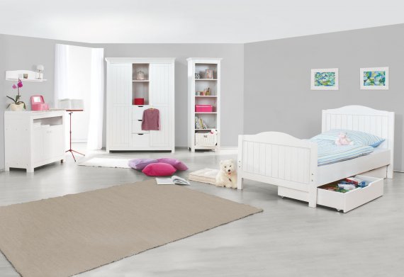 Børneværelses serien NINA er nostalgi og passer til landhus stil. Møblerne har synlige malede brædder, der giver det rustikke landhus look.