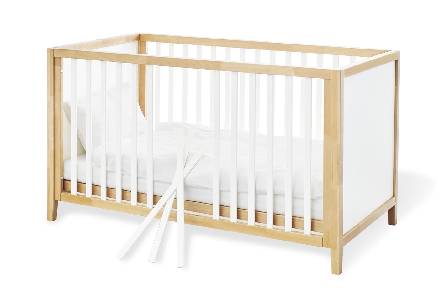 Pinolino kombi sengen har flade hvidmalede smalle tremmer. Lamelbunden er massiv og sengens sider forstærkede, så den er meget robust og stabil.
