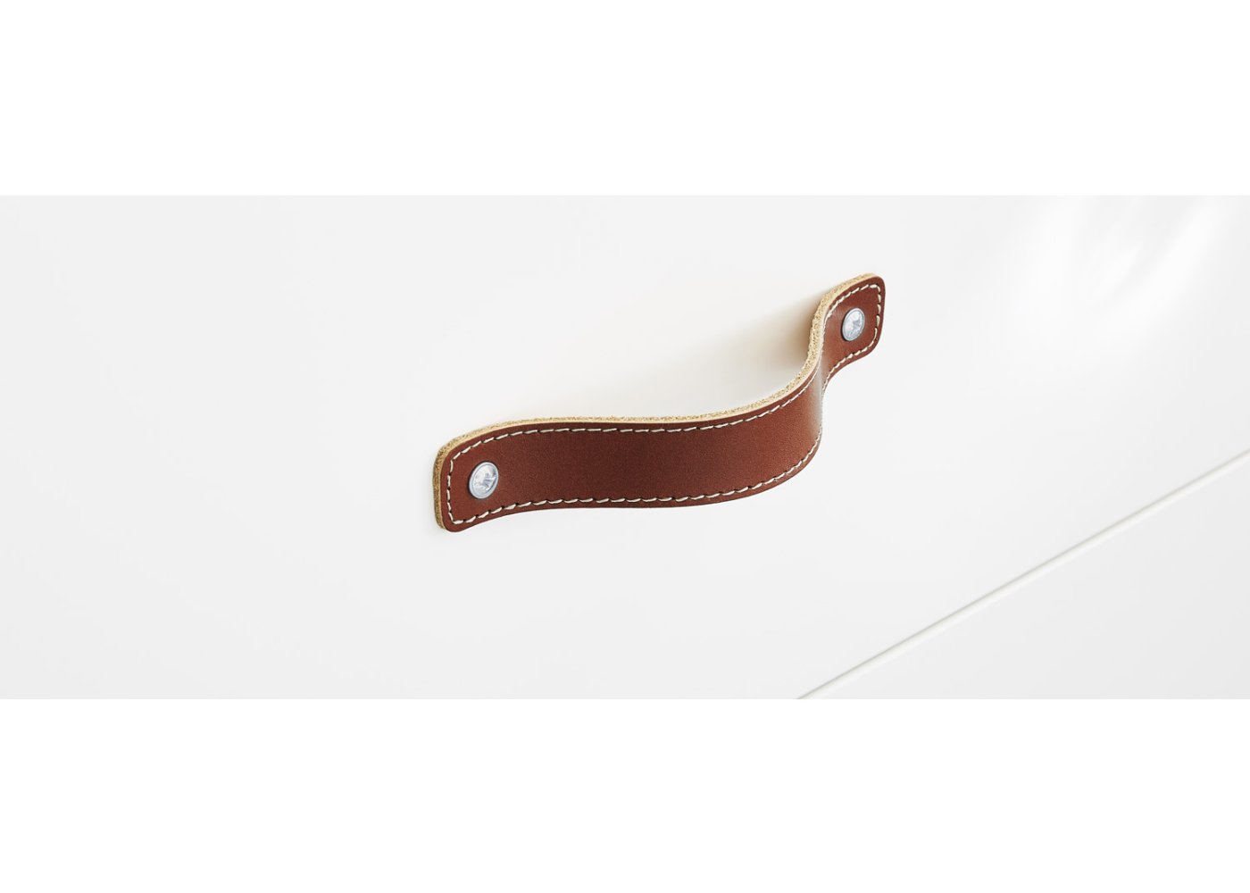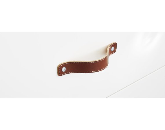Børneværelses serien Calimero er et flot mix af lyst træ og hvid og med gedigne møbelgreb i læder. Skuffer og skabe har Self-Soft-Close.