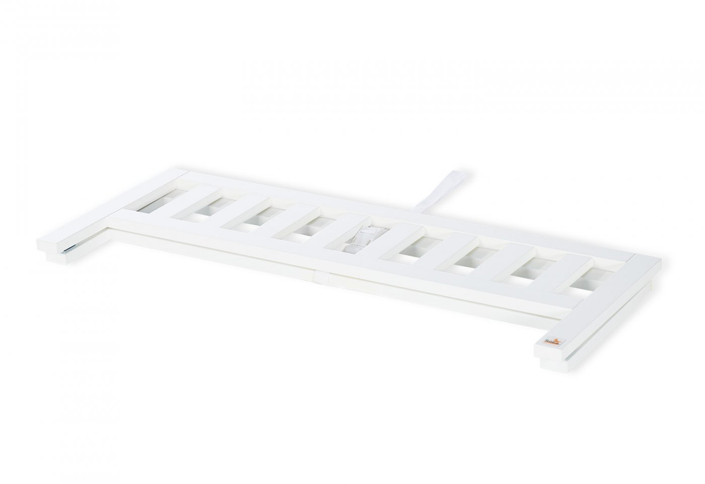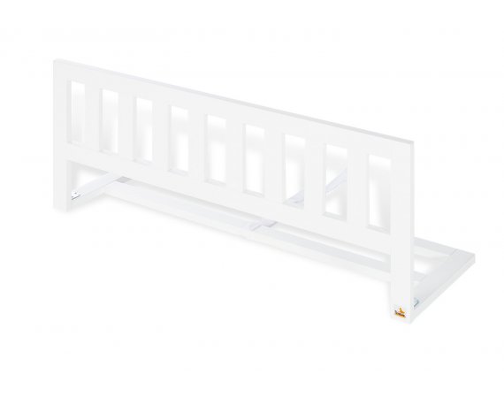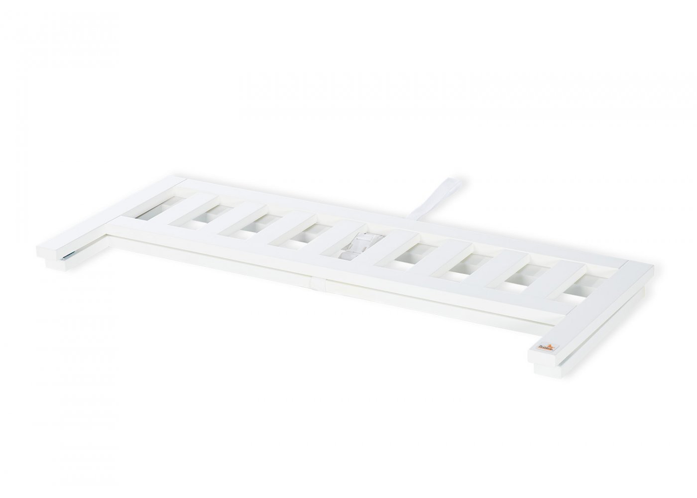 Specifikationer: Massiv bøg, hvid lakeret L 90 cm, B 33 cm, H 36 cm For at beskytte barnet mod at falde ud af sengen Skal ikke samles, fastholdes af madrassen 1 forbindelses bælte til optimal fastgørelse til lamelbund Egnet til madrasser op til en højde på 15 cm Anbefales til børn: 3-7år