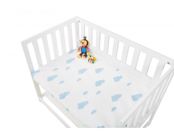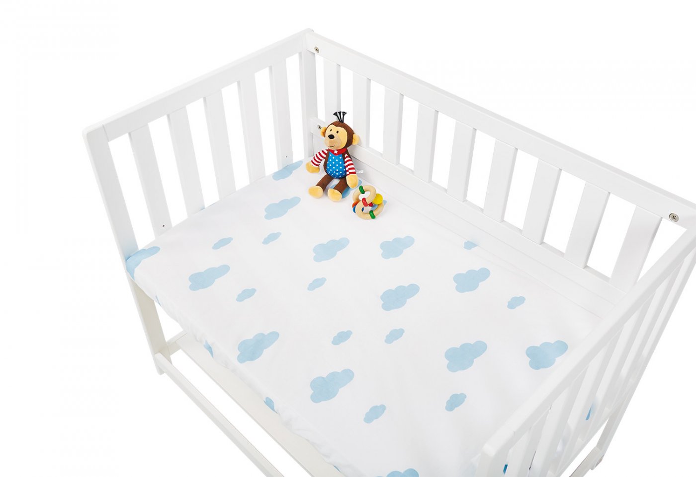 Sæt med to stk. Jersey stræklagen i 100% bomuld til vugge, Bedside Crib og barnevogn. Et med lyseblå skyer og et i hvidt.