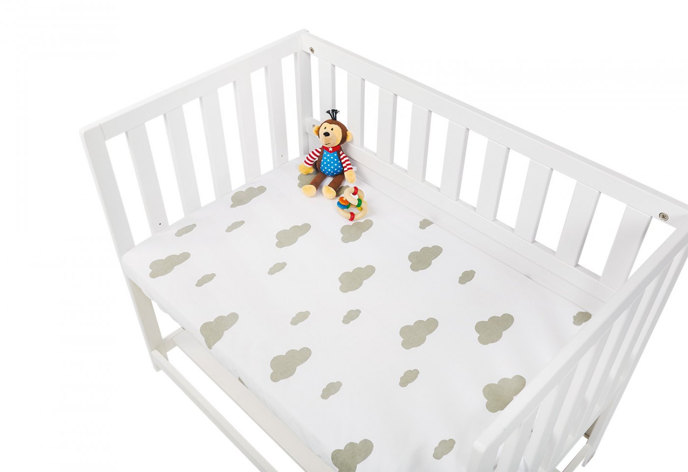Sæt med to stk. Jersey stræklagen i 100% bomuld til vugge, Bedside Crib og barnevogn. Et med grå skyer og et i hvidt.