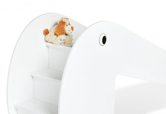 Specifikationer: Lakeret MDF, hvid lakeret L 154 cm, B 45 cm, H 68 cm Rutsje-højde er 54 cm Hældningsvinkel af rutsjebanen er 24 grader Med to øjne-klistermærker der kan klistres på siderne