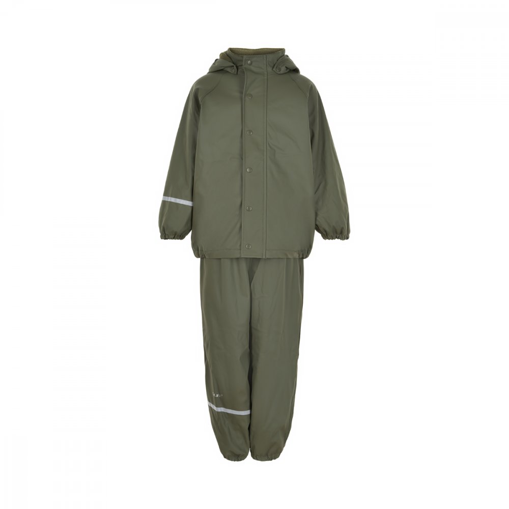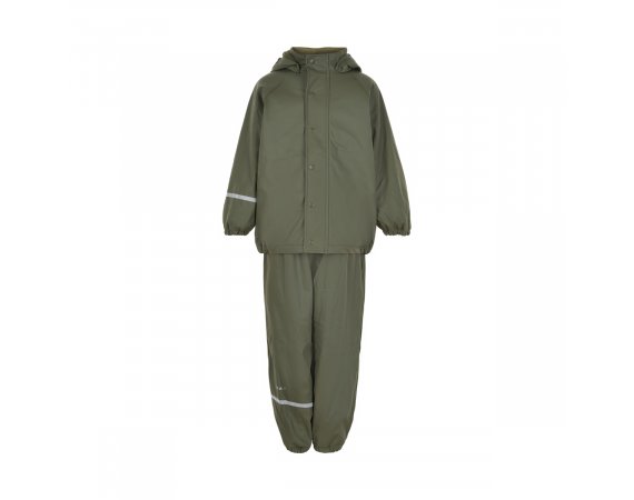 Regnsættet er i slidstærkt PU-materiale, med vandtætte svejsede sømme og et vandsøjletryk på 5000 mm, som sikrer et vand- og vindtæt sæt. Der er refleksdetaljer på ben, arm og hætte.