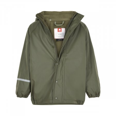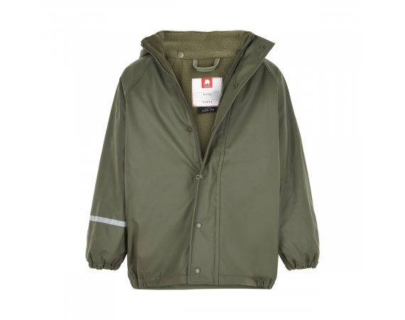 Jakke har aftagelig hætte med trykknapper, god lynlås og knaplukning foran. Der er elastik ved håndled, ankler og i begge sider i jakken ved kant.