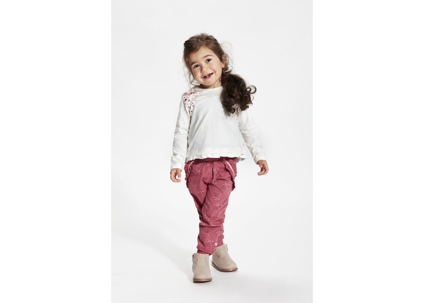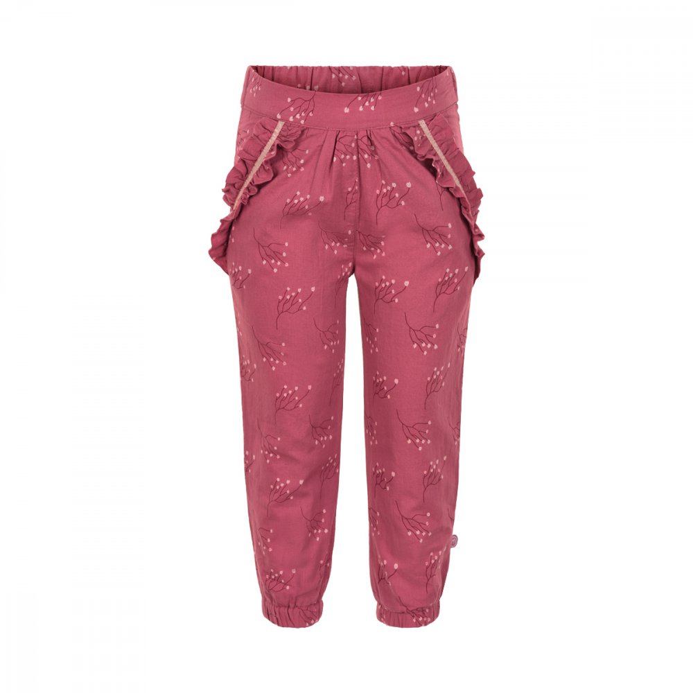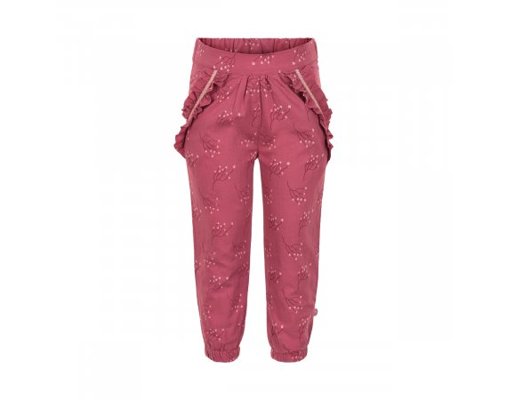 Bukserne har lommer foran med flæsekant og bånd i kontrastfarve.