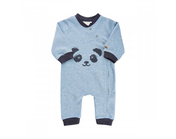 Sød blå bodysuit med print af panda ansigt i sweat materiale Jumpsuiten har ribkant i kontrastfarve ved hals, håndled og ankler. Dragten har trykknapper og lynlås på fronten. Tekstil: 80% Bomuld og 20% Polyester
