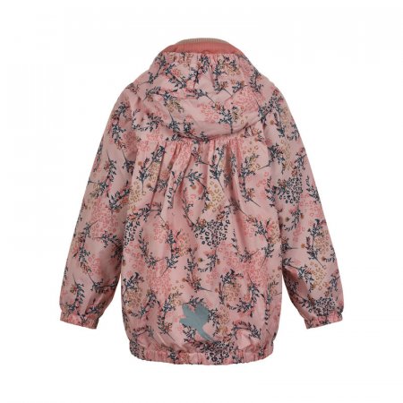 Her får du en smart overgangsjakke med flot blomsterprint. Jakken har varm ribkant i halsåbning, elastik ved håndled og hætte. Hætten er aftagelig med trykknapper. Jakken har en sød flæsedetalje foran på brystet, og rynk bagpå i samme højde. Den lukkes med lynlås foran. Bagpå flot fugle-refleks.