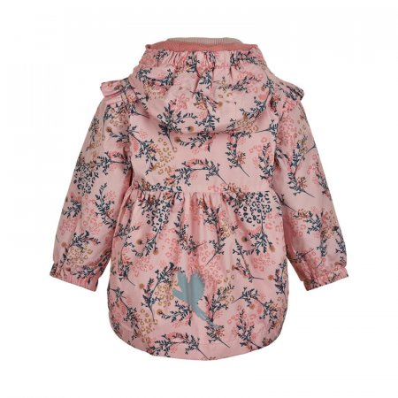 Her får du en smart overgangsjakke med flot blomsterprint. Jakken har varm ribkant i halsåbning, elastik ved håndled og hætte. Hætten er aftagelig med trykknapper. Jakken er delt i livet med fin rynk og har sød flæsedetalje på skuldre. Den lukkes med lynlås foran.